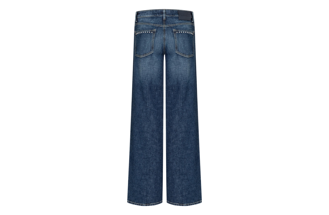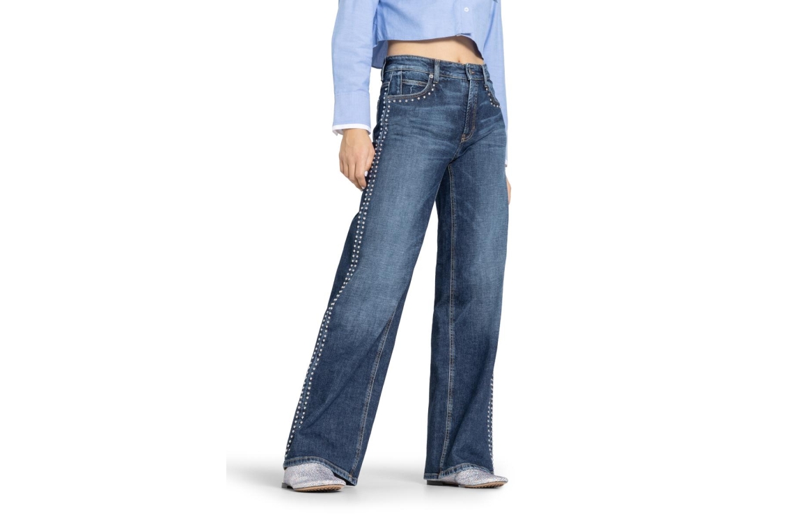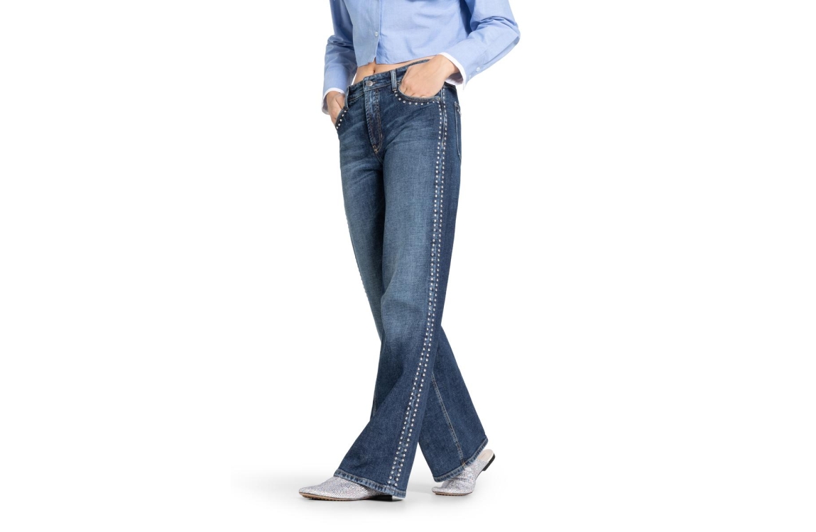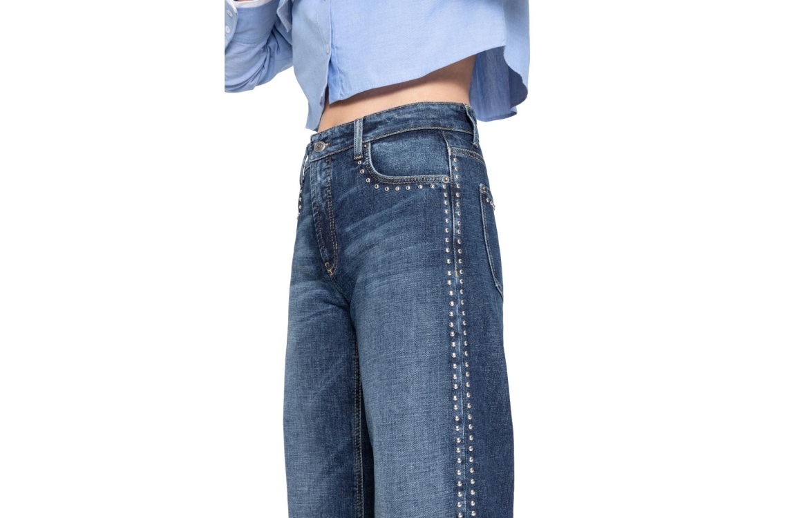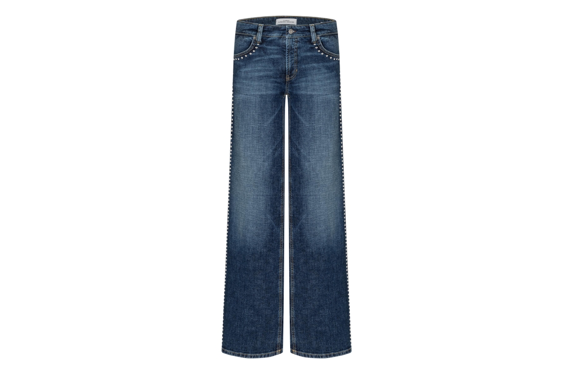 Cambio Aimee 9132-0035-18 jeans. Dit wijdvallende model sluit door middel van een knoop en een rits. Deze blauwe denim jeans van Cambio is bewerkt met zilveren studs, riemlusjes en verschillende steekzakken. De jeans bevat een lichte stretch.