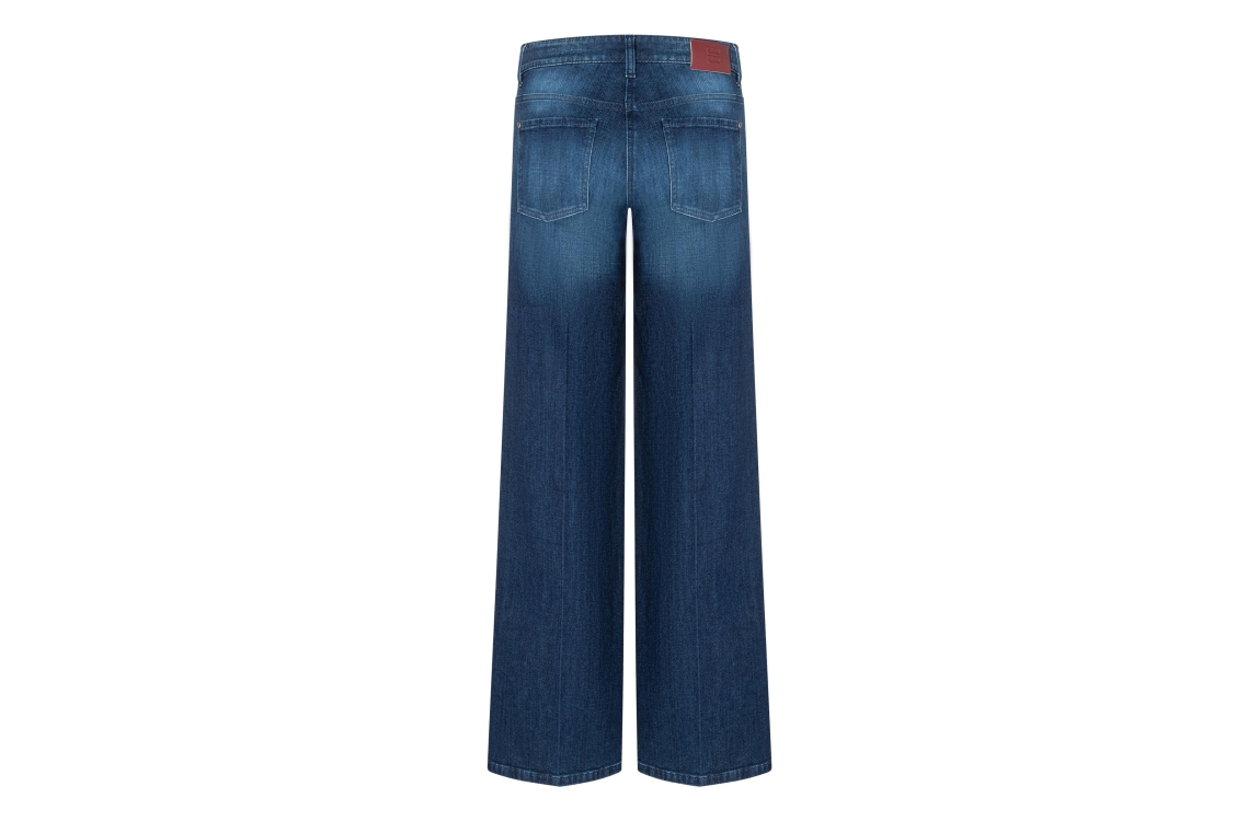 Cambio broek 9151-0144-00. Dit wide fit model sluit door middel van een knoop- en ritssluiting en is voorzien van ceintuurlussen. Deze donkere denim broek van Cambio beschikt over twee steekzakken aan de voor- en achterzijde en is afgewerkt met een burgundy labelpatch.