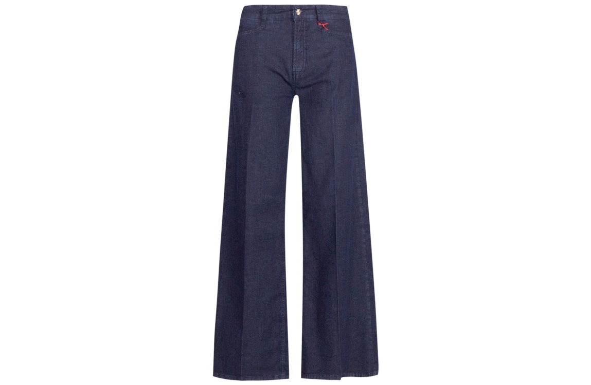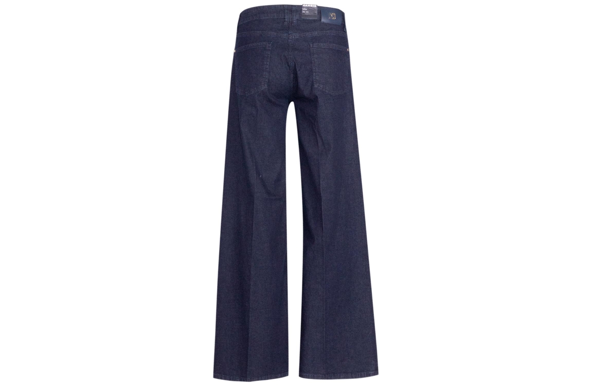 Cambio broek Amini 9116-0033-01. Dit wijdvallende model sluit door middel van een knoop en rits en heeft lange wijde pijpen. Deze donker blauwe jeans van Cambio is afgewerkt met zakken.
