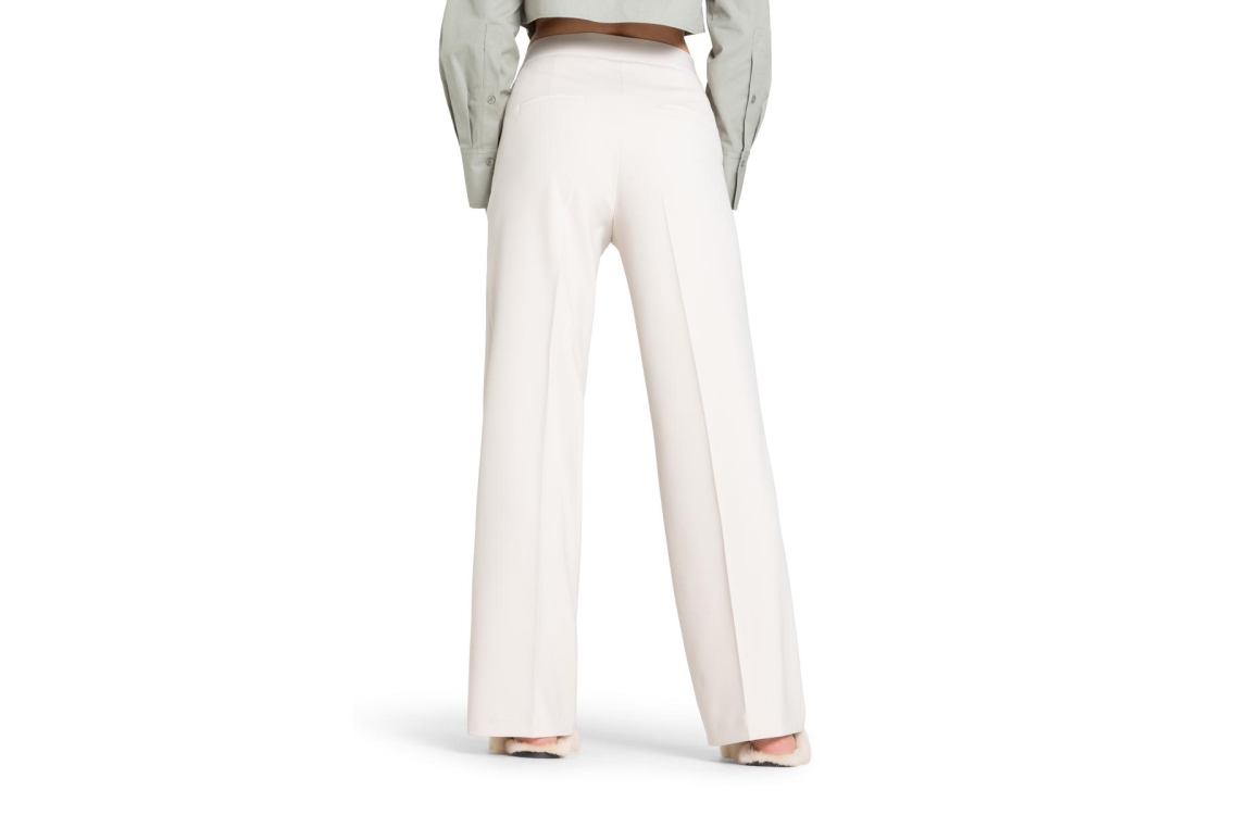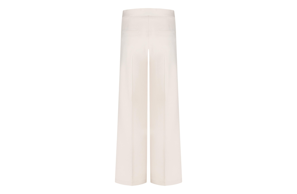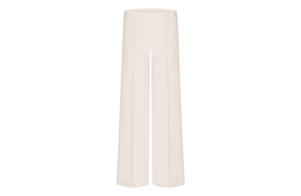 Cambio broek Ava 6052-0222-19. Dit wide fit model sluit door middel van een elastische boord, gedetailleerd met het merkembleem. Deze off-white broek van Cambio is voorzien van twee steekzakken aan de voorzijde en twee paspelzakken aan de achterzijde. Het model is gedetailleerd met een plooidetail over de lengte van beide benen.