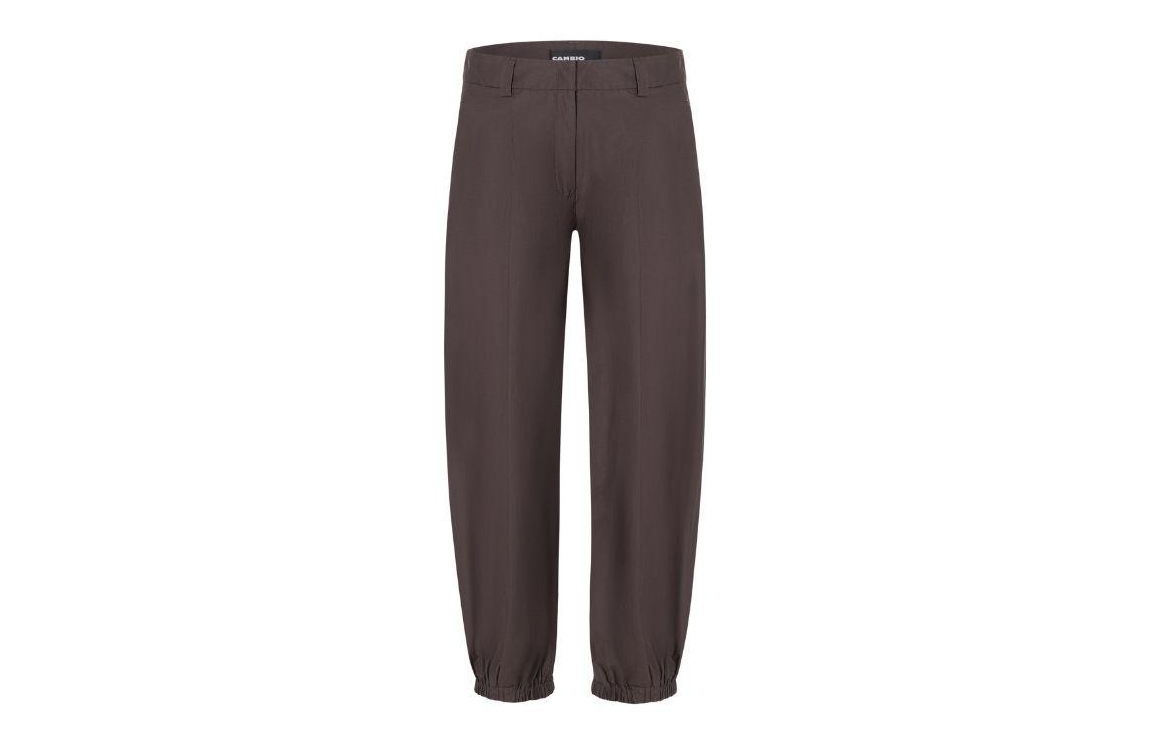 Cambio broek 7240-0499-02 789. Dit ballon fit sluit door middel van een knoop- en ritssluiting en is voorzien van ceintuurlussen. Deze donkerbruine broek van Cambio is gedetailleerd met plooidetails, voorzien van twee steekzakken aan de voorzijde en twee paspelzakken aan de achterzijde.