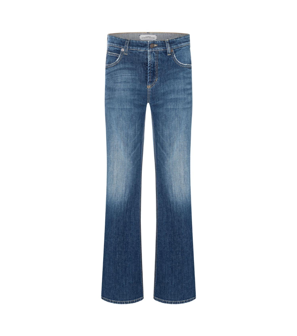 Cambio Fabienne 5413 Destroyed hem. Dit flared fit model sluit door middel van een knoop- en ritssluiting en is voorzien van ceintuurlussen. Deze denim broek van Cambio beschikt over twee steekzakken aan de voor- en achterzijde.