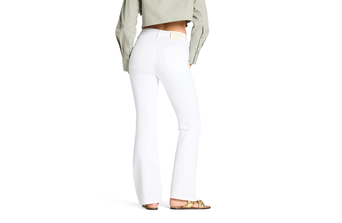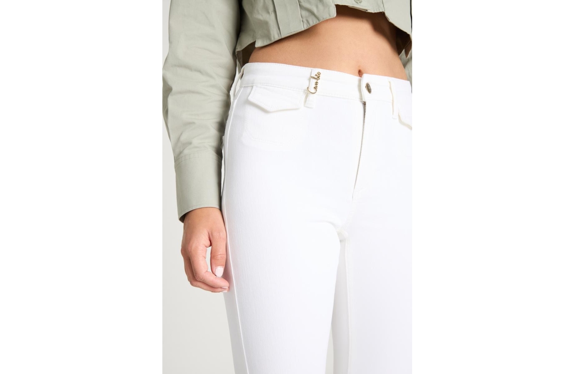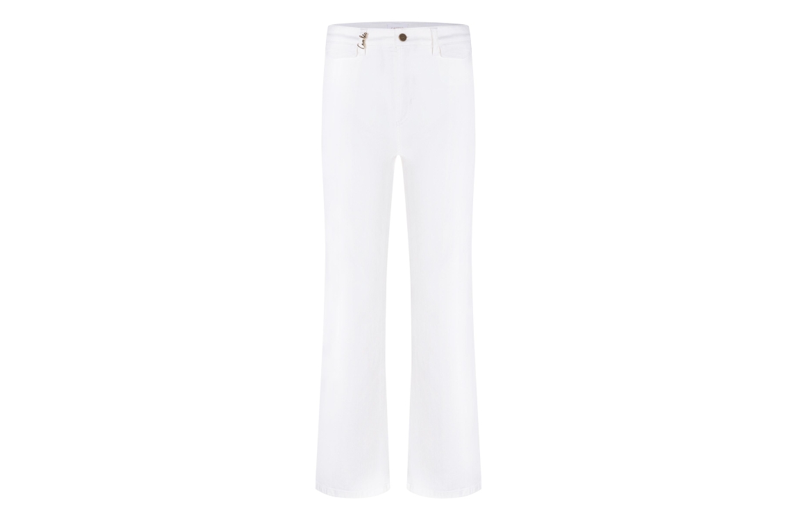 Cambio Fabienne jeans 9049-0095-01. Dit rechtvallend model sluit door middel van een knoop en rits. Deze witte jeans van Cambio is voorzien van riemlusjes, verschillende zakken en afgewerkt met een gouden detail aan de bovenzijde.