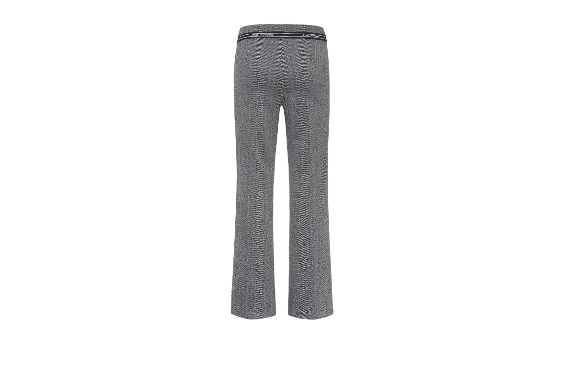 Cambio broek Faith. Dit aangesloten model is aan de bovenzijde voorzien van een elastische boord. Deze zwart/witte broek van Cambio is aan de bovenzijde bewerkt met een zwarte bies. Dit model is bewerkt met een print.