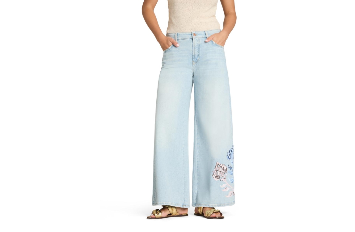 Cambio Palazzo jeans 9132-0023-16. Dit wijdvallend model sluit door middel van een knoop en een rits. Deze lichtblauwe denim jeans van Cambio is voorzien van een bloemenmotief aan de onderzijde en afgewerkt met riemlusjes en 5-pocket broekzakken.
