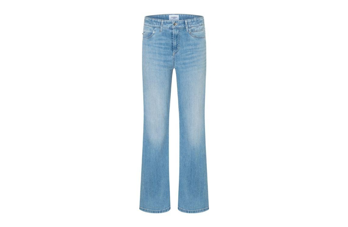 Cambio broek 9118-0097-03. Dit flared fit model sluit door middel van een knoop- en ritssluiting en is voorzien van ceintuurlussen. Deze denim broek van Cambio is uitgevoerd in een 5-pocketmodel en is afgewerkt met een plooi over de lengte van de been.