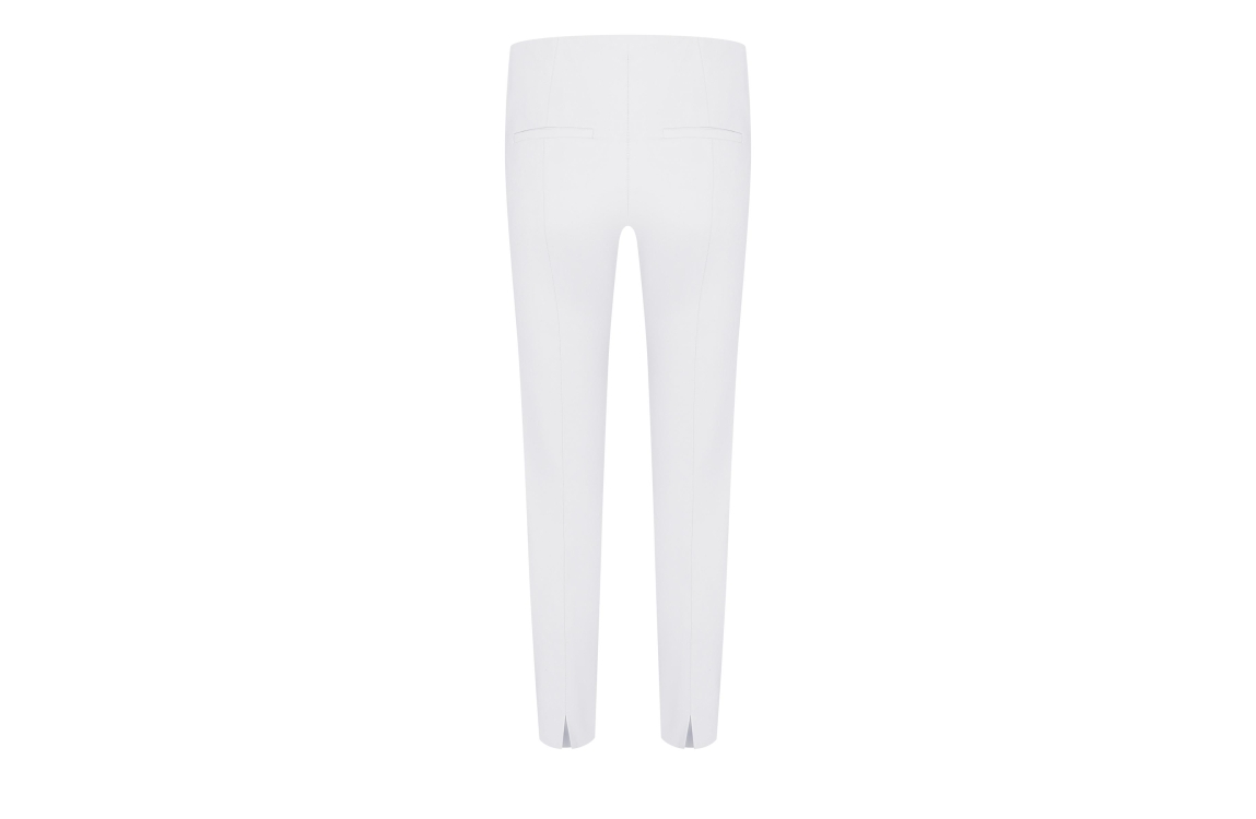 Cambio pantalon Ros 8299-0287-00. Dit slim fit model sluit door middel van knoop- en ritssluiting en is aan de bovenzijde bewerkt met een elastische boord. Deze witte broek van Cambio is uitgevoerd in een stretch kwaliteit en heeft decoratieve paspelzakken aan de achterzijde. Dit model is bij de pijpen afgewerkt met splitjes.