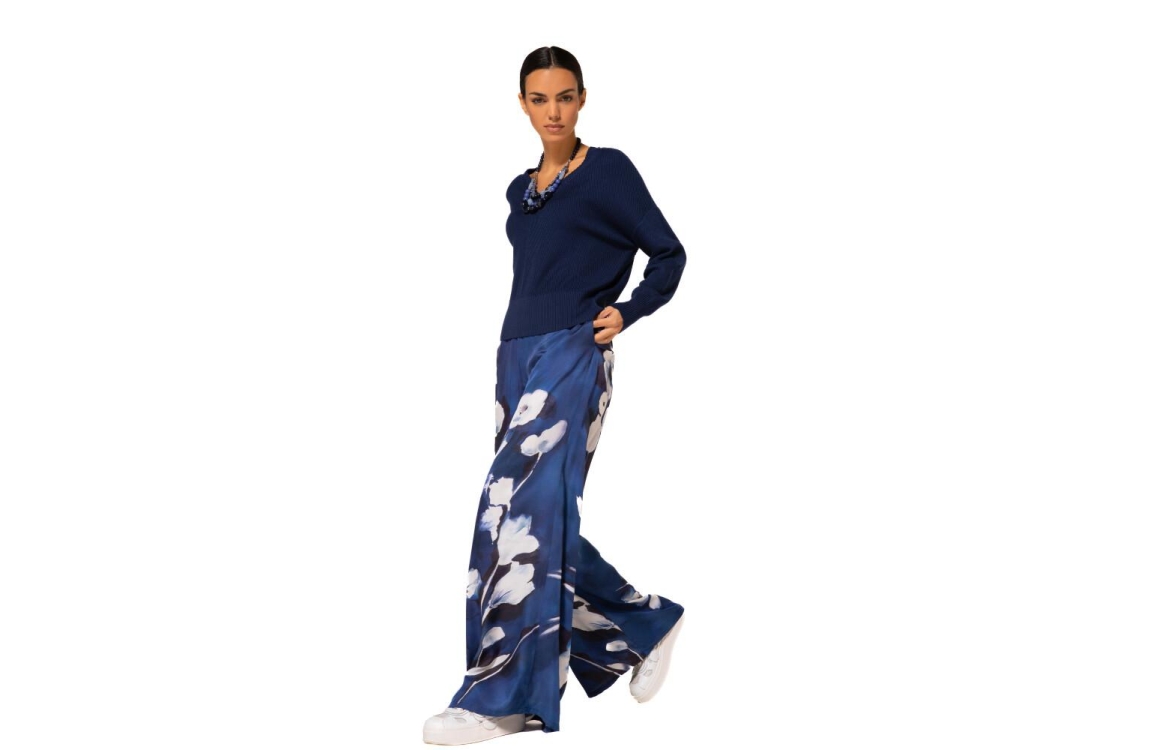 Caroline Biss Broek Palazzo 1583/29. Dit rechtvallend model sluit aan de bovenzijde door middel van een elastische boord. Deze blauwe broek van Caroline Biss is bewerkt met een bloemenprint en heeft een zwierige pasvorm.
