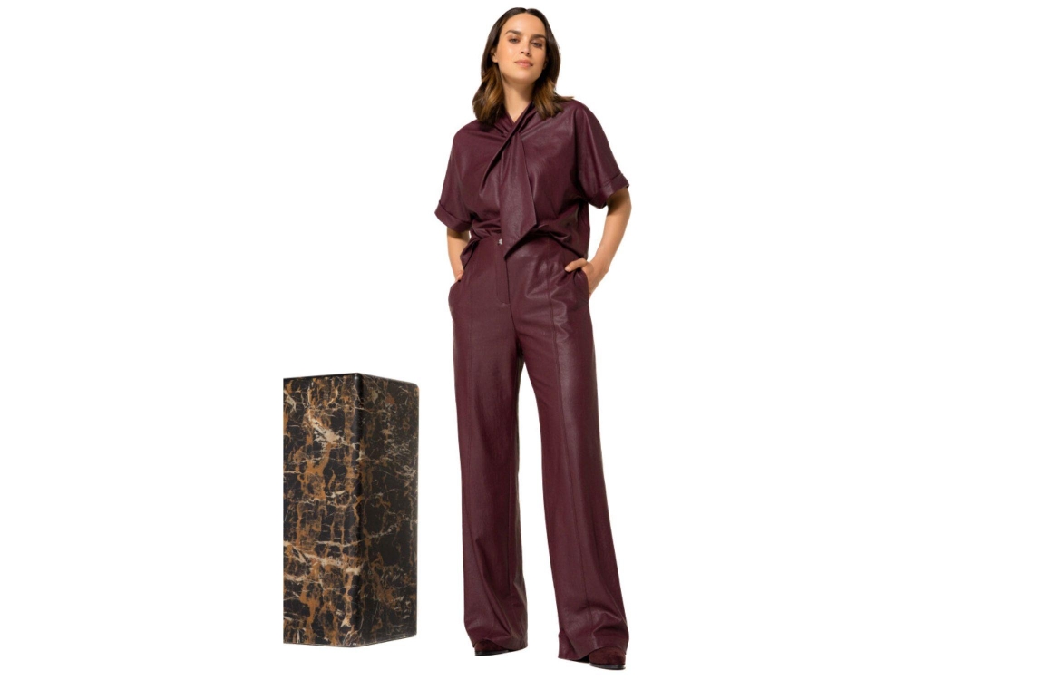 Caroline Biss Broek vegan leather 55 Wine. Dit rechtvallende model sluit aan de bovenzijde door middel van een rits en knoop. Deze rode broek van Caroline Biss heeft twee steekzakken in de zijnaad en opgestike zakken op de achterzijde. Dit model heeft subtiele sierstiksels aan de voorzijde op de pijpen en is uitgevoerd in vegan leater. Deze broek heeft een normale waist.