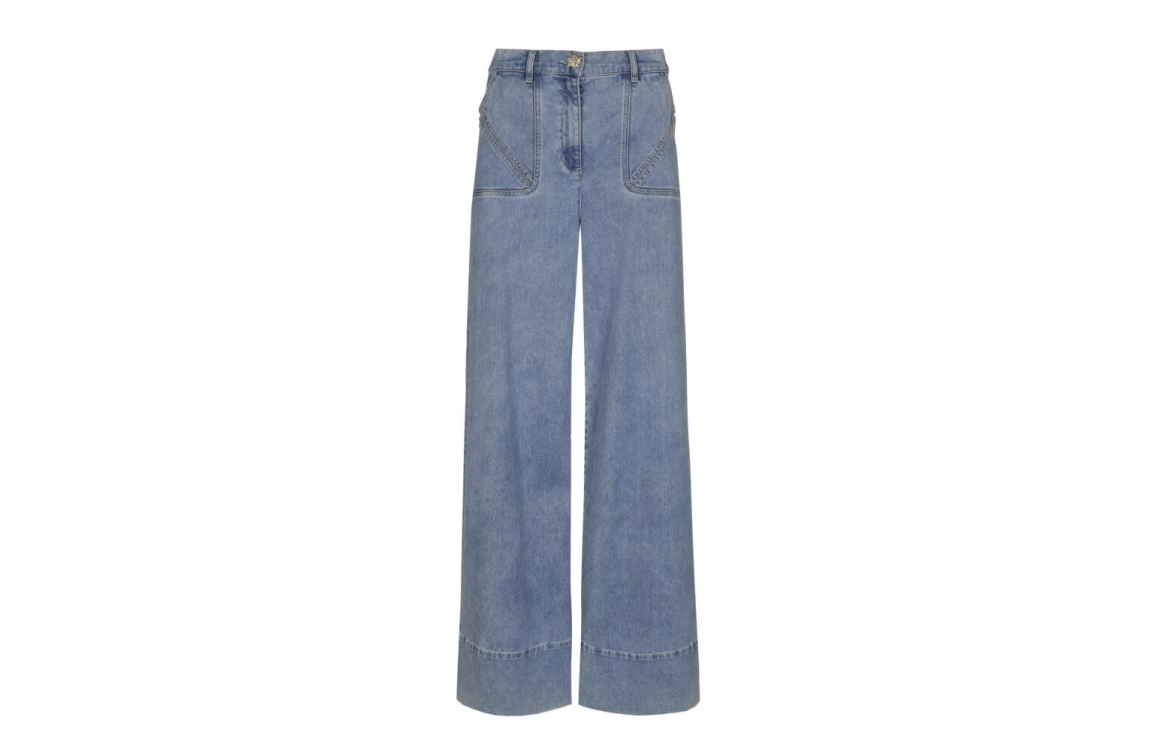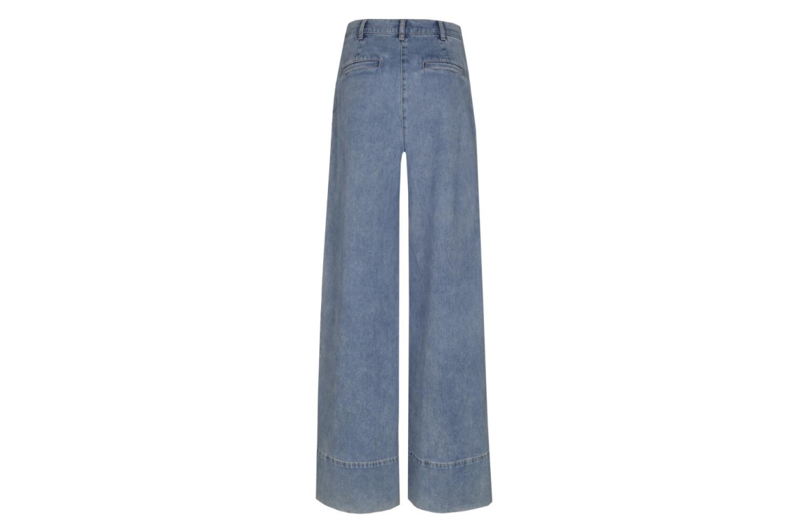 Caroline Biss Jeans 4500/25. Dit wijdvallende model sluit aan de bovenzijde door middel van een knoop en rits. Deze licht blauwe jeans van Caroline Biss is bewerkt met zakken op het voorpand, gouden details en een grove omslag aan de onderzijde. Deze jeans bevat een beetje stretch en beschikt over riemlusjes.