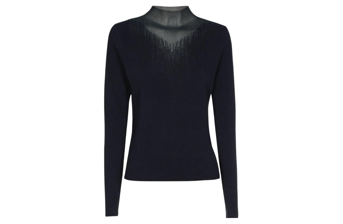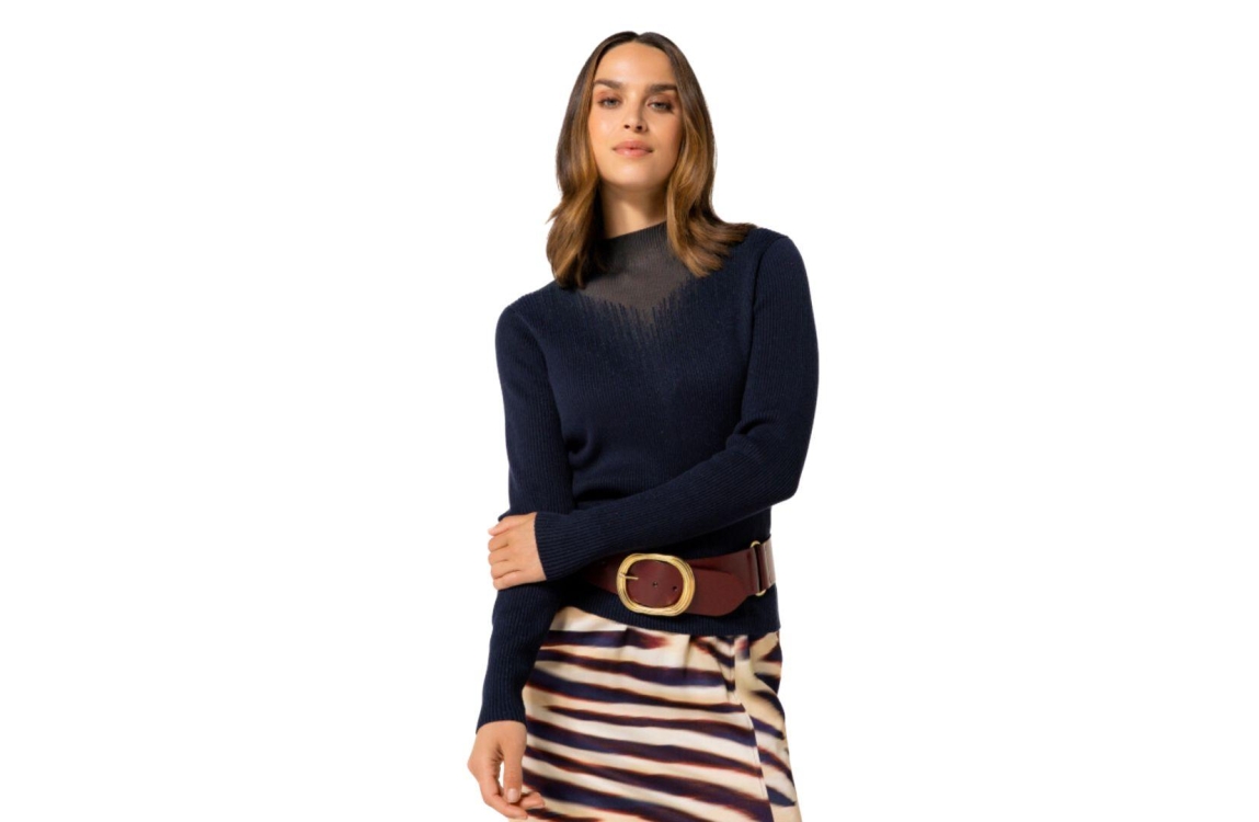 Caroline Biss trui 4253/20. Dit licht getailleerd model heeft een turtleneck en lange mouwen. Deze donkerblauwe trui van Caroline Biss is all-over bewerkt met glitterlurex en is gedetailleerd met een decolleté en ribtricot effect.