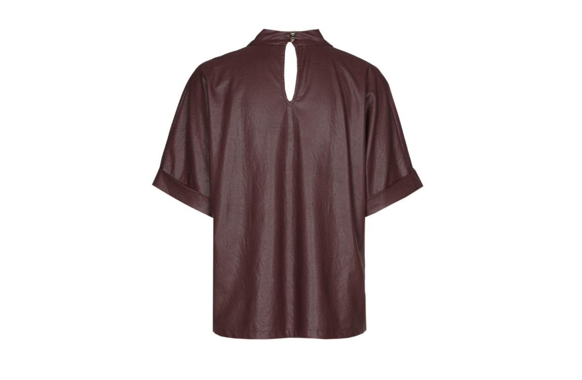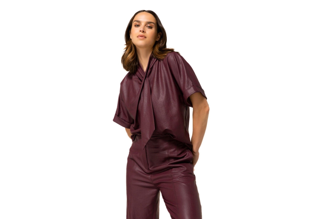 Caroline Biss Top vegan leather 55 Wine. Dit rechtvallende model heeft een V-hals en korte mouwen met een omslagboord. Deze rode top van Caroline Biss heeft een druppelsluiting met knopen aan de achterzijde. Dit model heeft een strik detail aan de voorzijde en is uitgevoerd in vegan leather.