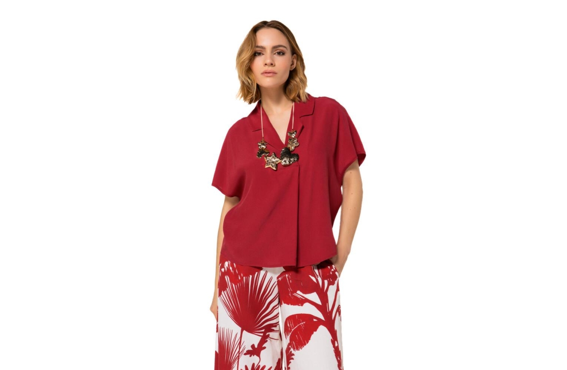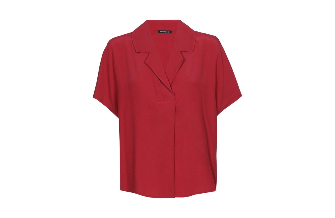 Caroline Biss Top 1606/50. Dit rechtvallend model heeft een v-hals met kraag en korte mouwen. Deze rode top van Caroline Biss is voorzien van een overslag aan de voorzijde.