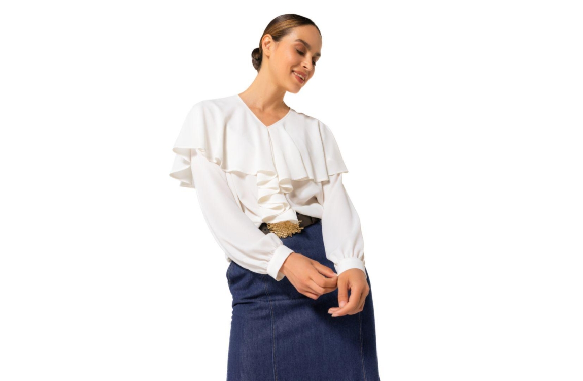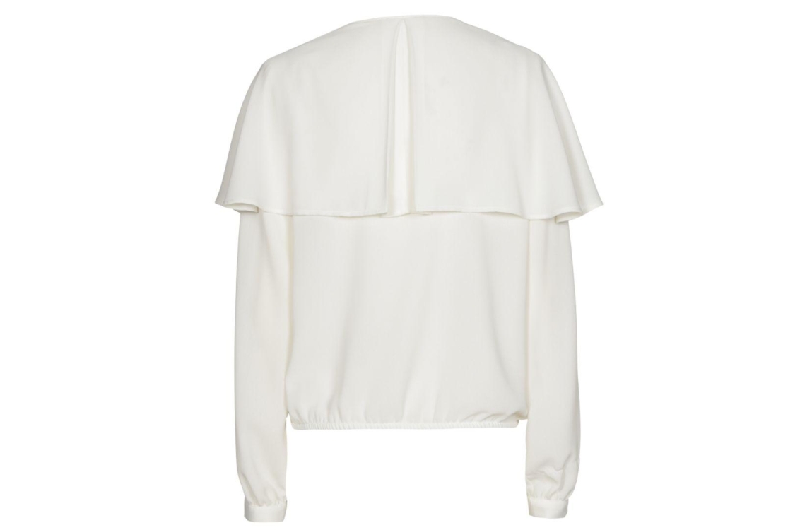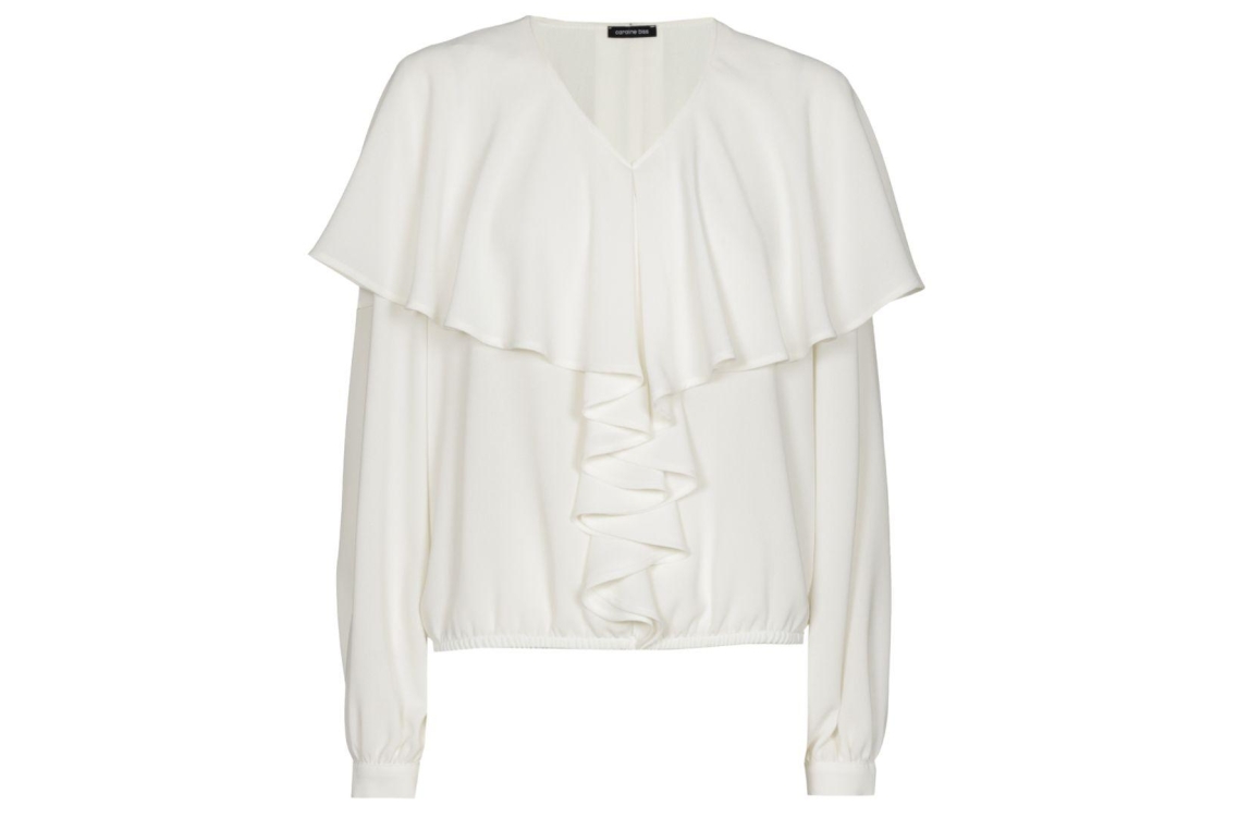 Caroline Biss blouse 4667/93. Dit rechtvallend model heeft een V-hals, lange mouwen en een elastische zoomboord. Deze off-white blouse van Caroline Biss is uitgevoerd met het volant effect en heeft een platte plooi in de rugpand.