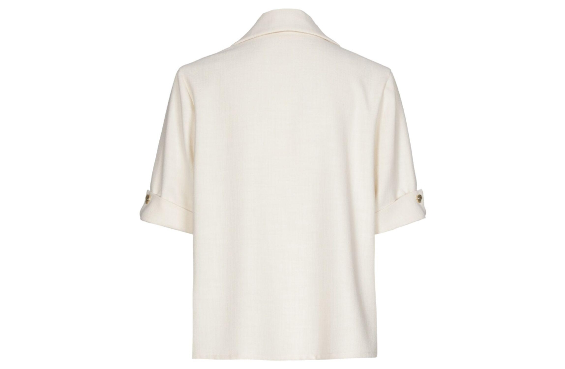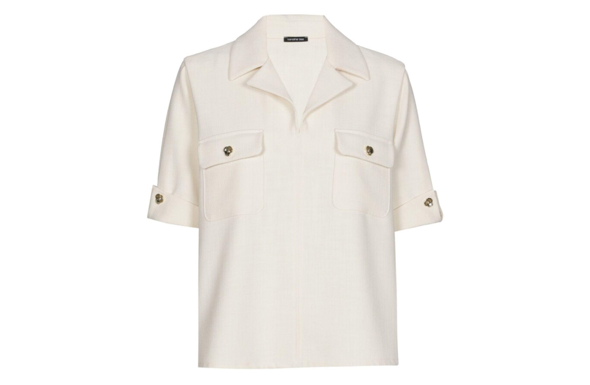 Caroline Biss Tuniek Natural. Dit rechtvallende model is voorzien van een reverskraag en heeft korte mouwen met omslagboord. Deze off-white blouse van Caroline Biss is afgewerkt met opgestikte klepzakken met knoopdetails.