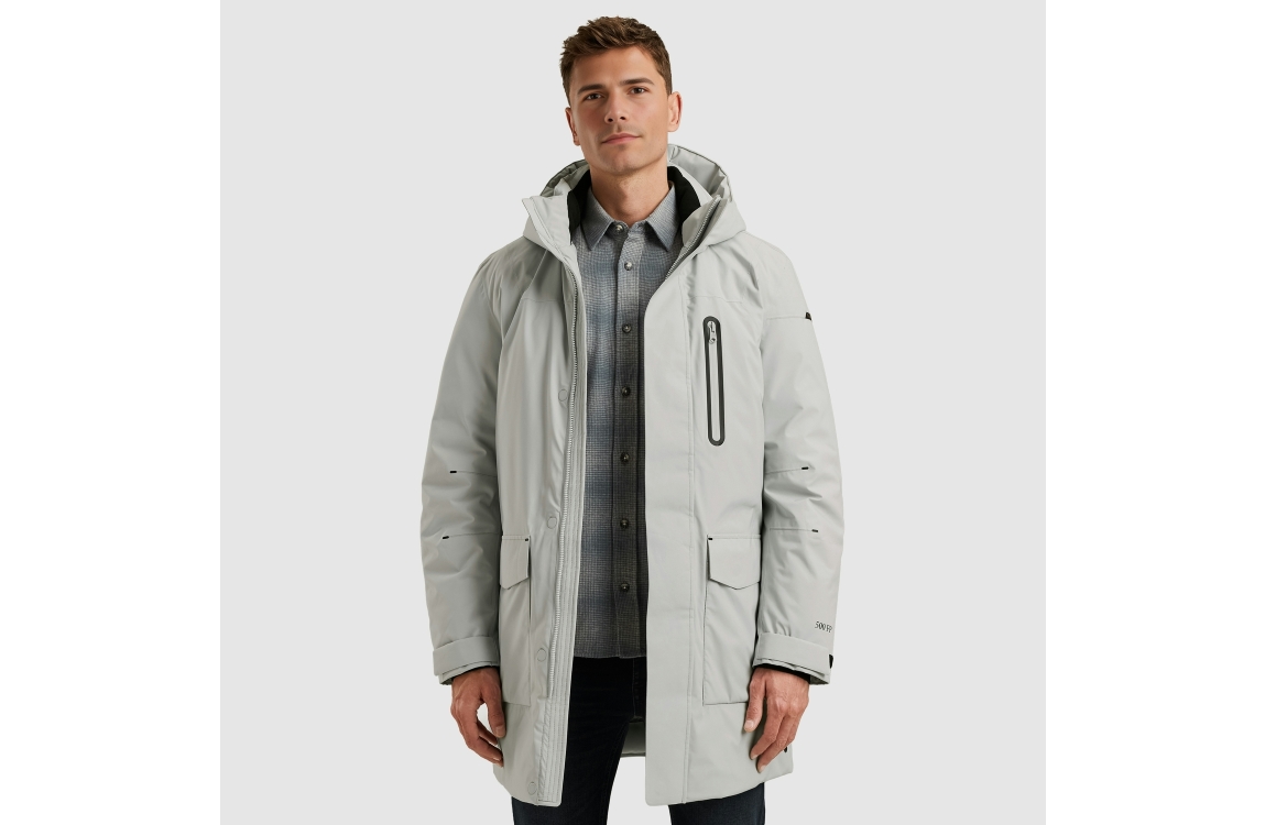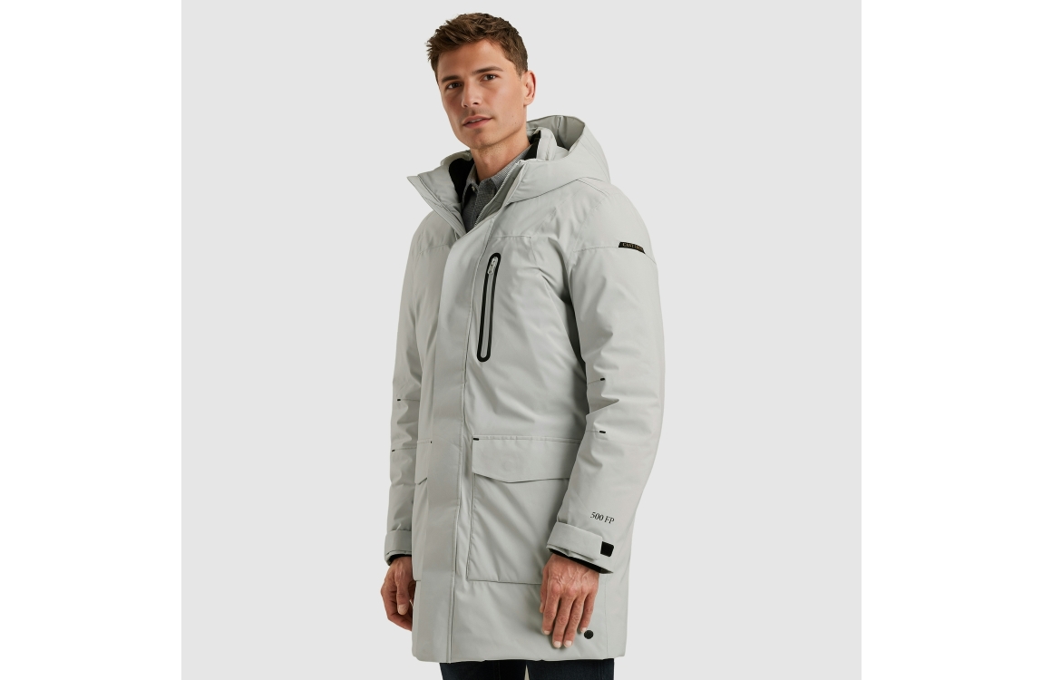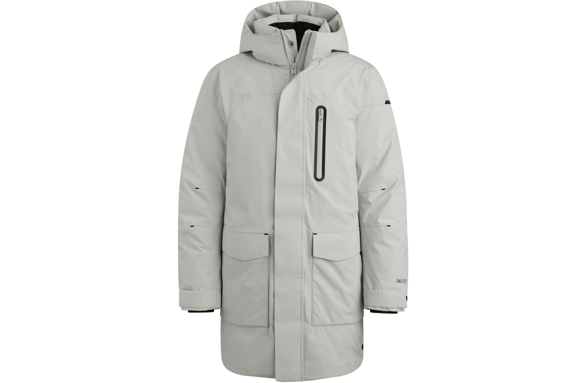Cast Iron Parka jacket ULTI-MECH/Ramrod. Dit rechtvallende model heeft lange mouwen en een capuchon. Deze high rise melange jas van Cast Iron sluit door rits en knopen en beschikt 2 steekzakken, een borstzak en een binnenzak, verder is deze jas afgewerkt met een merkembleem op de mouw.