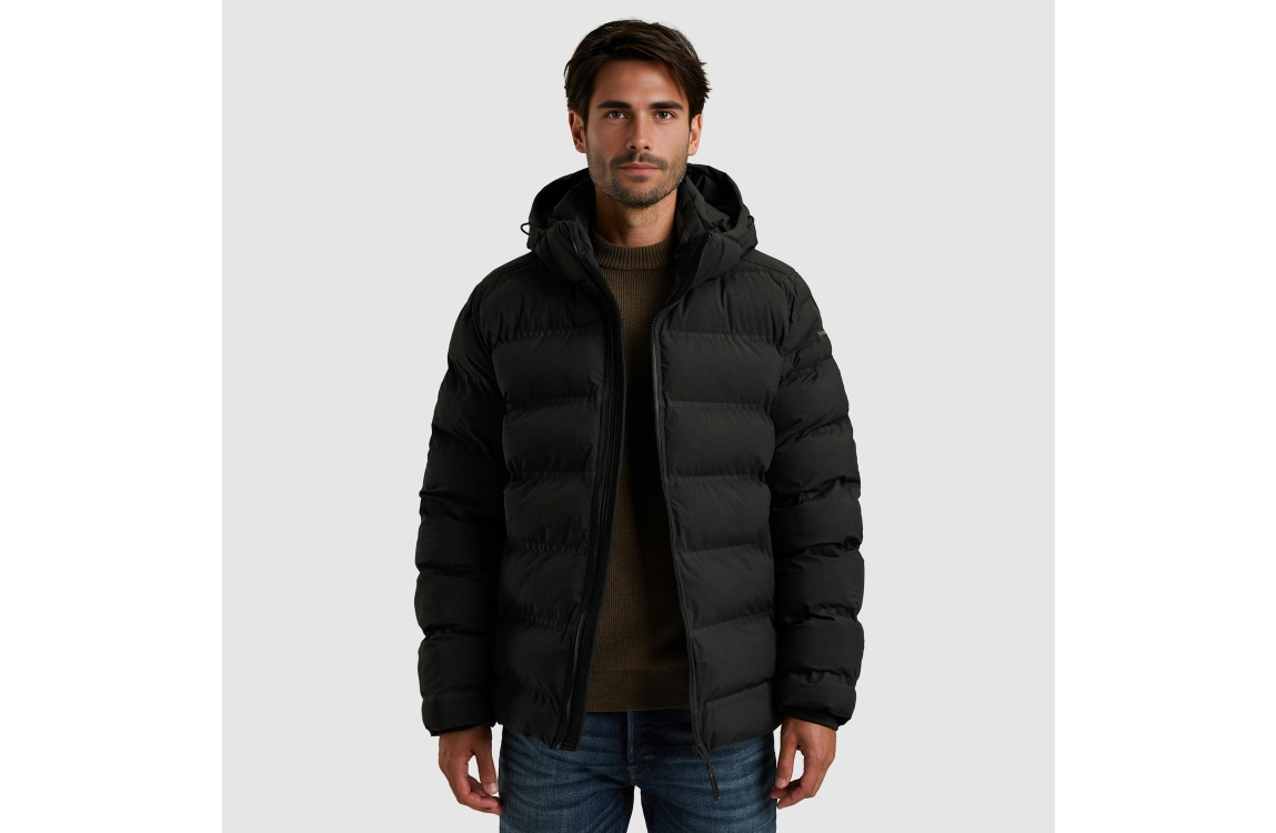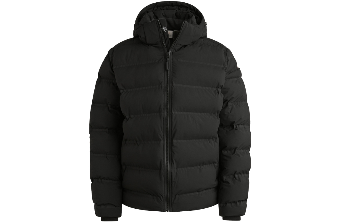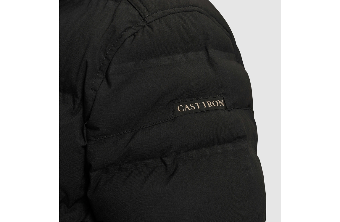 Cast Iron jas CJA2509145. Dit rechtvallende model heeft een opstaande kraag met afneembare capuchon en lange mouwen. Deze zwarte jas van Cast Iron sluit aan de voorzijde door middel van een rits en is voorzien van twee knoopzakken en een ritszak. Het model is op de linker- mouw en schouder gedetailleerd met het merkembleem.