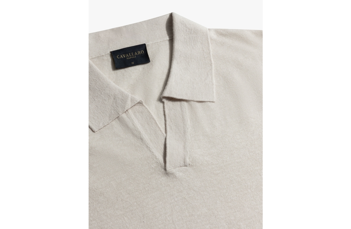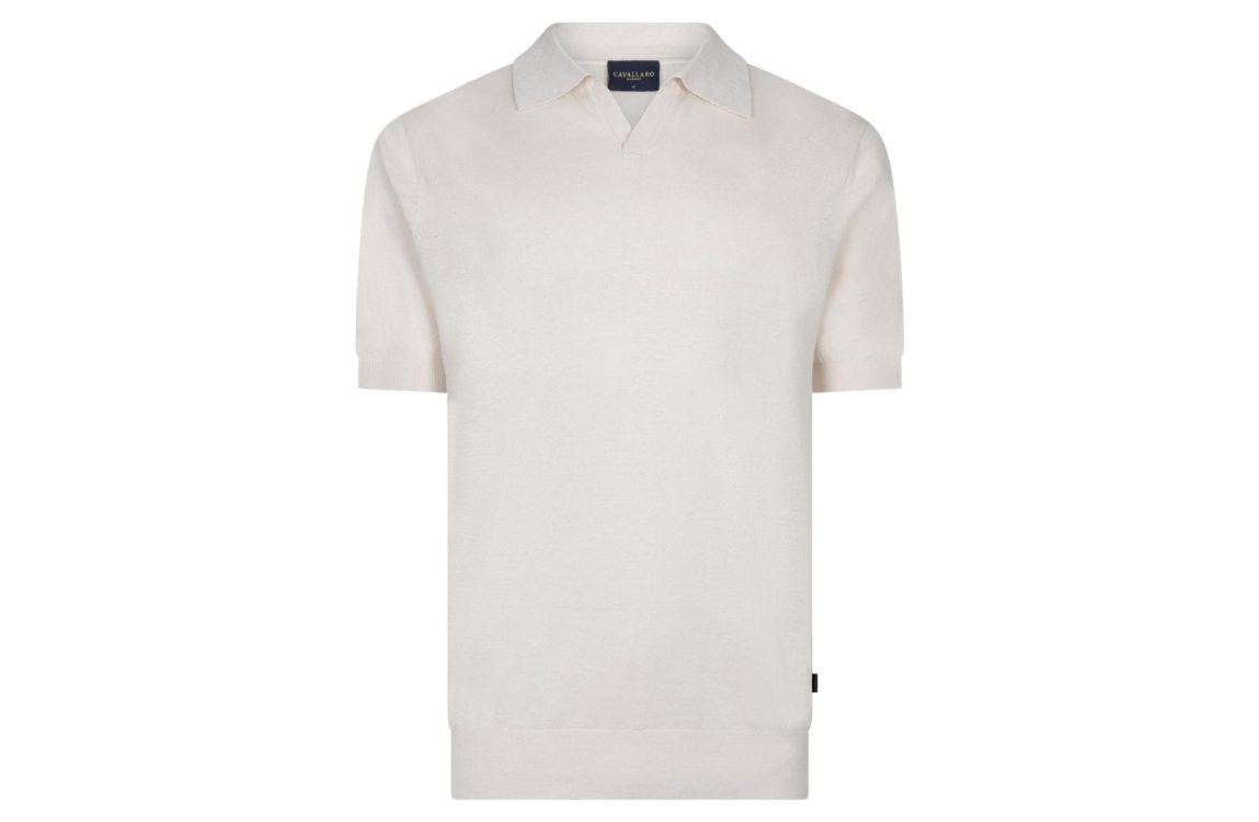 Cavallaro Erlino Polo 116261033. Dit regular fit model heeft een openstaande kraag en korte mouwen. Deze beige polo van Cavallaro is afgewerkt met elastische boorden aan de onderzijde.