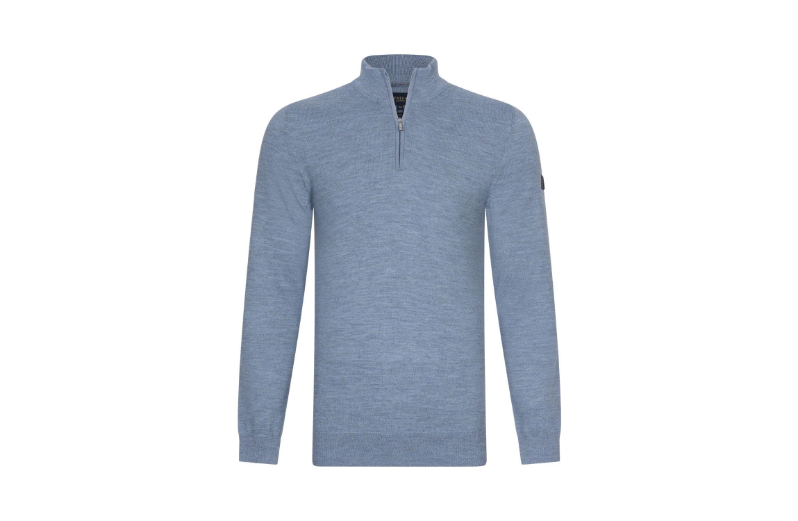 Cavallaro Merino Half Zip Pullover 970000 Grey blue. Dit rechtvallende model heeft een opstaande kraag die sluit door een rits en heeft lange mouwen. Deze grijs/blauwe pullover van Cavalloro is afgewerkt met boorden.