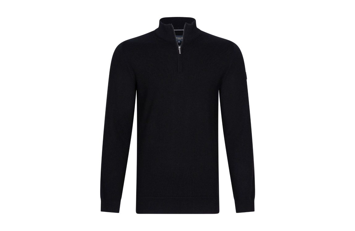 Cavallaro Merino Half Zip Pullover 999000 Black. Dit rechtvallende model heeft een opstaande kraag die sluit door een rits en heeft lange mouwen. Deze zwarte pullover van Cavalloro is afgewerkt met boorden.
