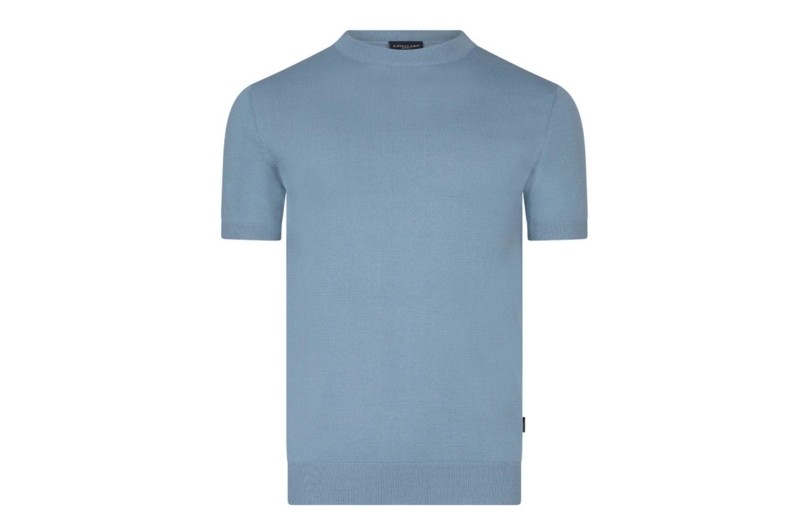 Cavallaro Milo Tee 117261009. Dit rechtvallend model is voorzien van een ronde hals en heeft korte mouwen. Deze lichtblauwe T-shirt van Cavallaro is uitgevoerd in een fijne rib kwaliteit en bevat stretch.