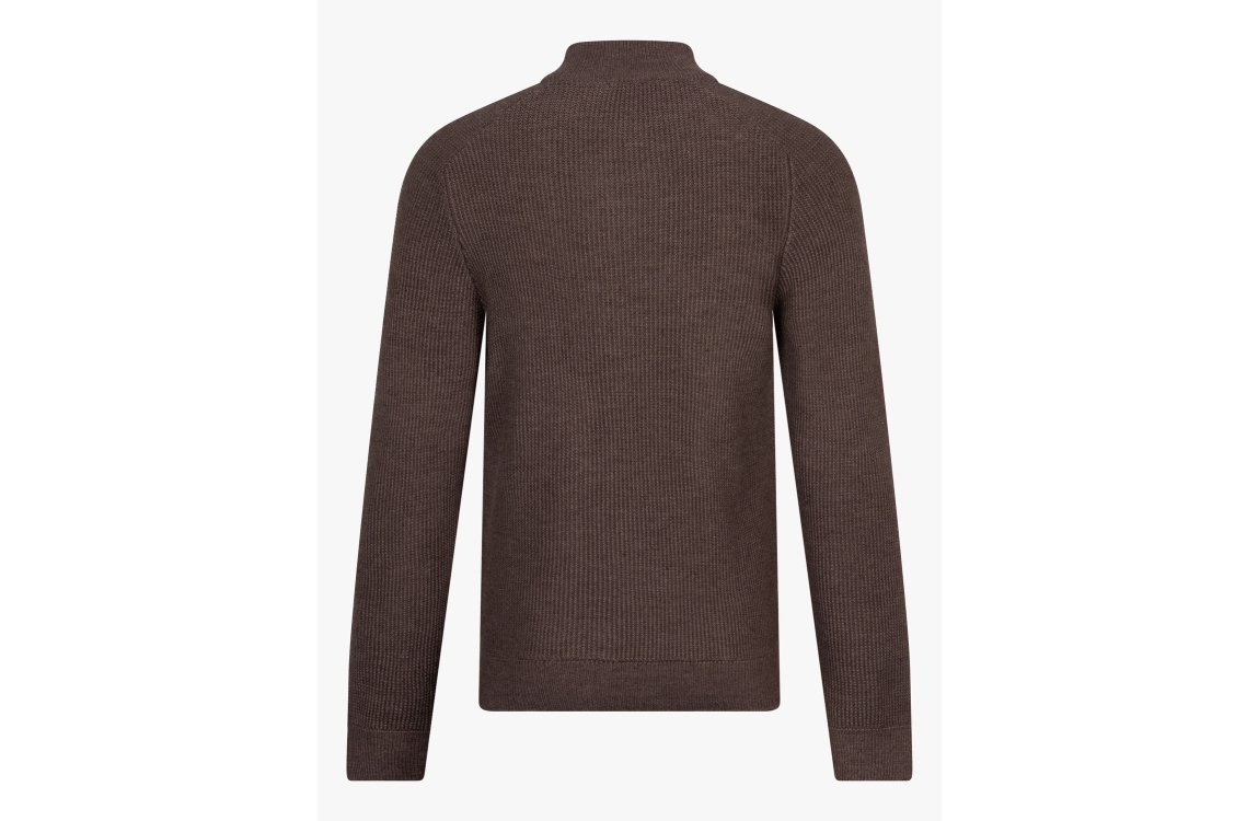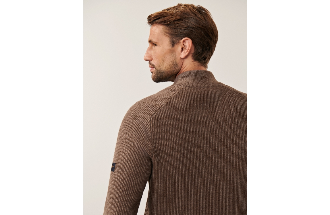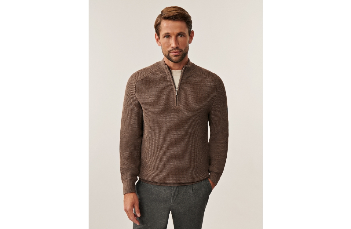 Cavallaro Corsico Sagio Half Zip Pullover. Dit slim fit model heeft lange mouwen en een hoge kraag. Deze taupe pullover van Cavallaro sluit door een half zip rits, heeft een gewoven structuur en is afgewerkt met rib boorden en heeft een merk embleem op de mouw.