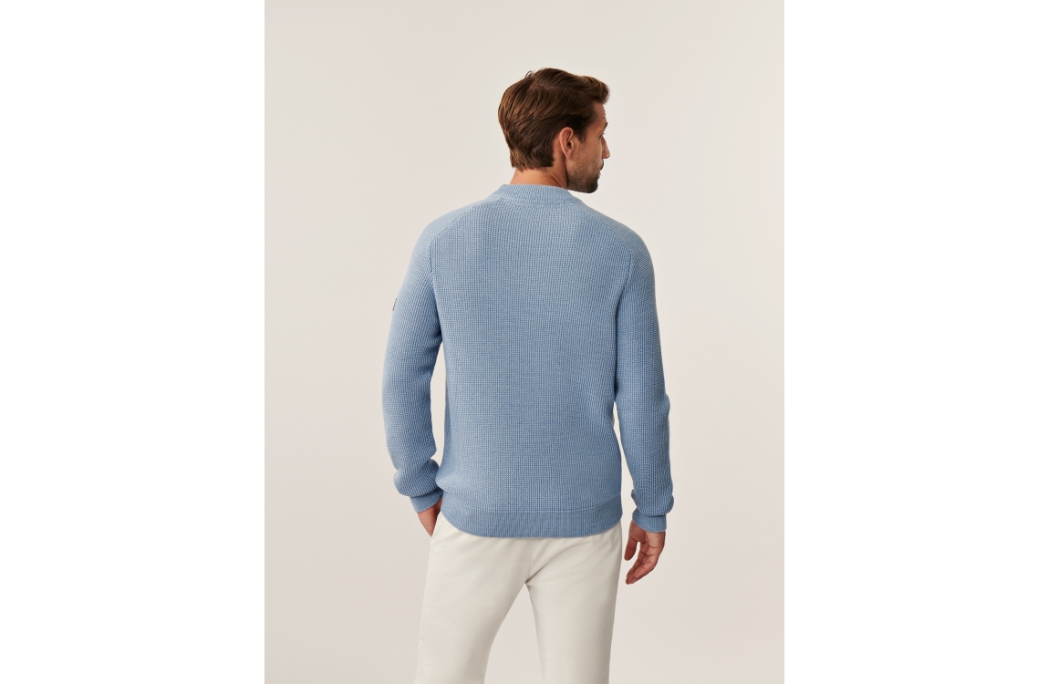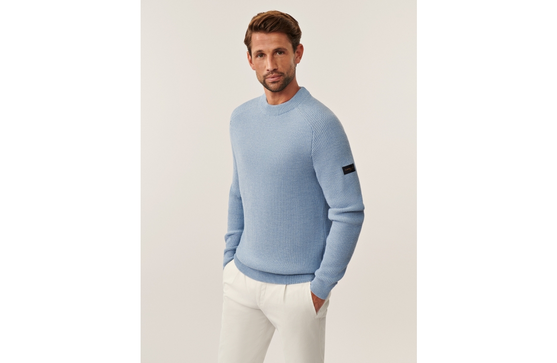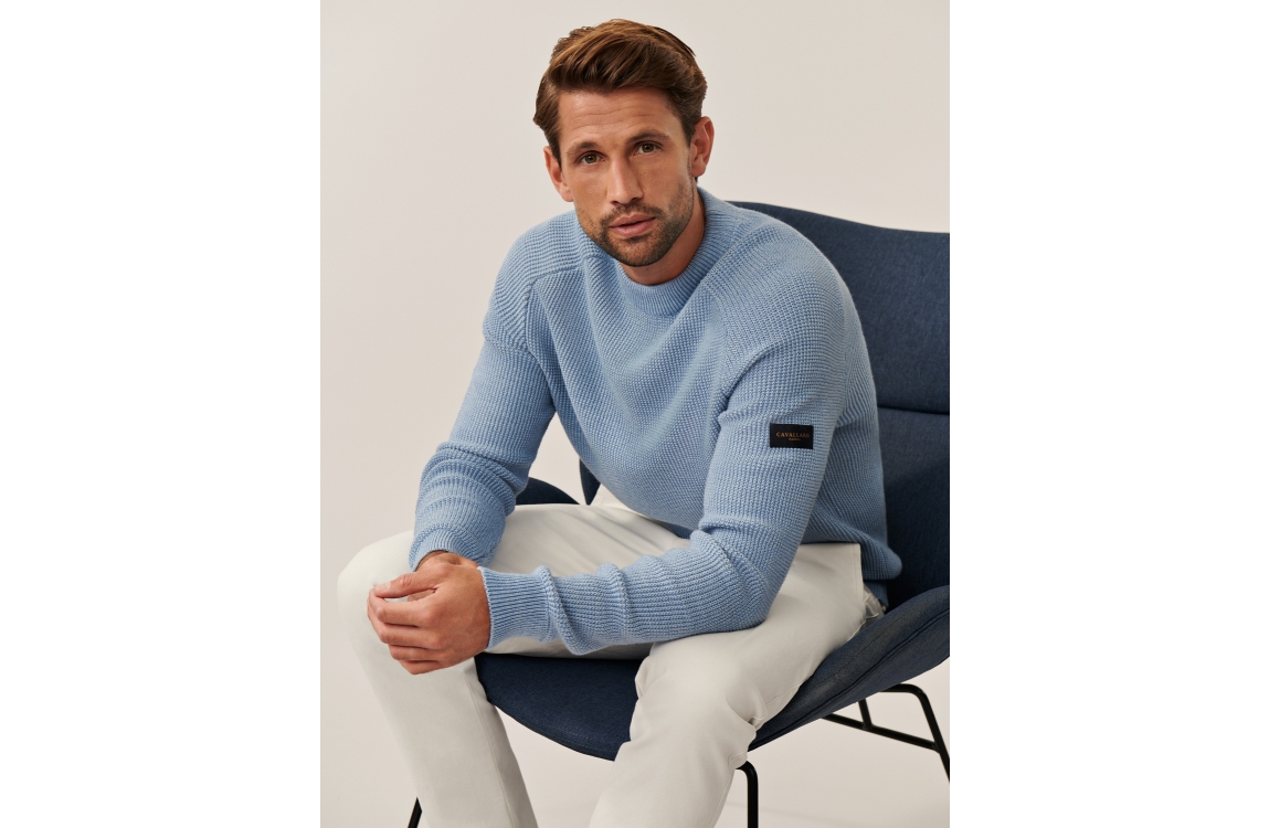 Cavallaro pullover Sagio Round Neck. Dit regular fit model heeft lange mouwen en een ronde kraag. Deze licht blauwe pullover van Cavallaro is afgewerkt met boorden en een merkembleem op de arm en heeft een allover gewoven structuur.