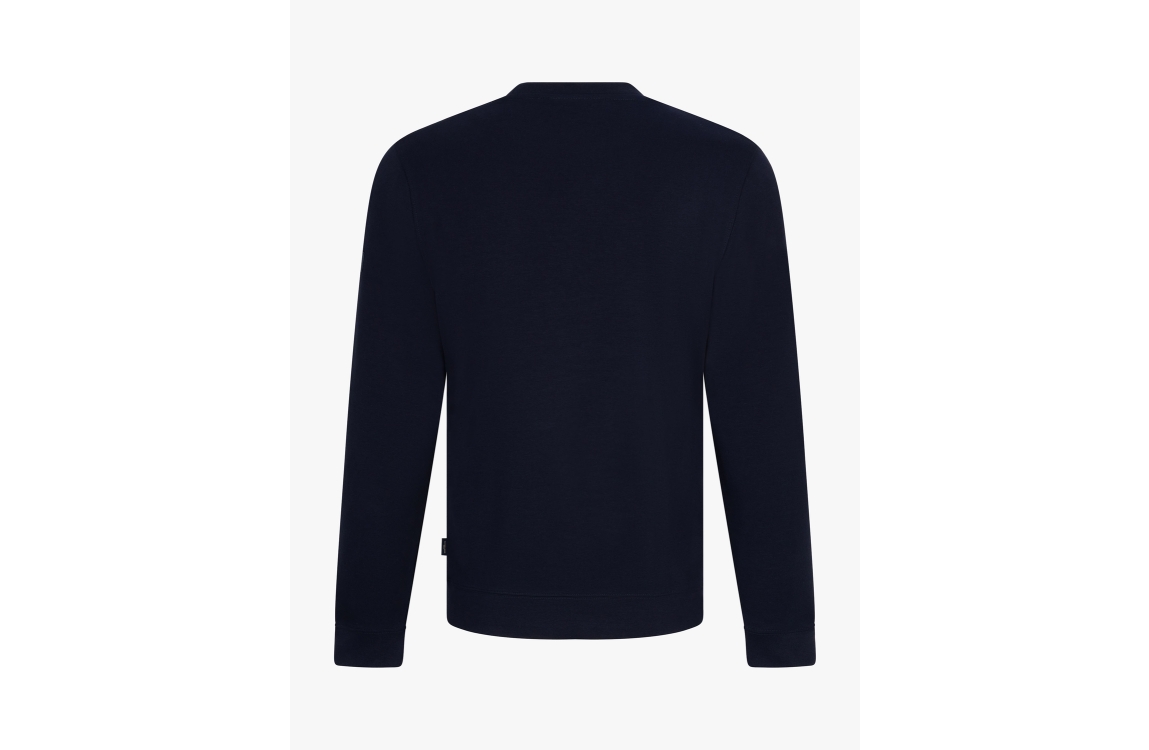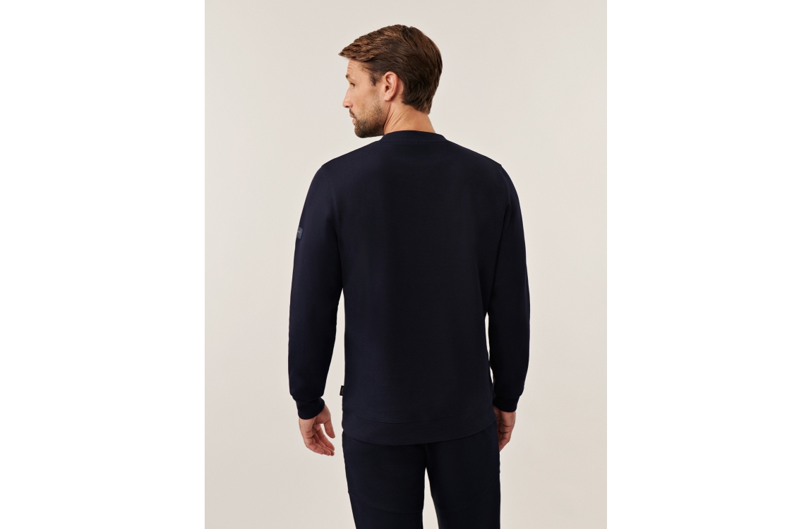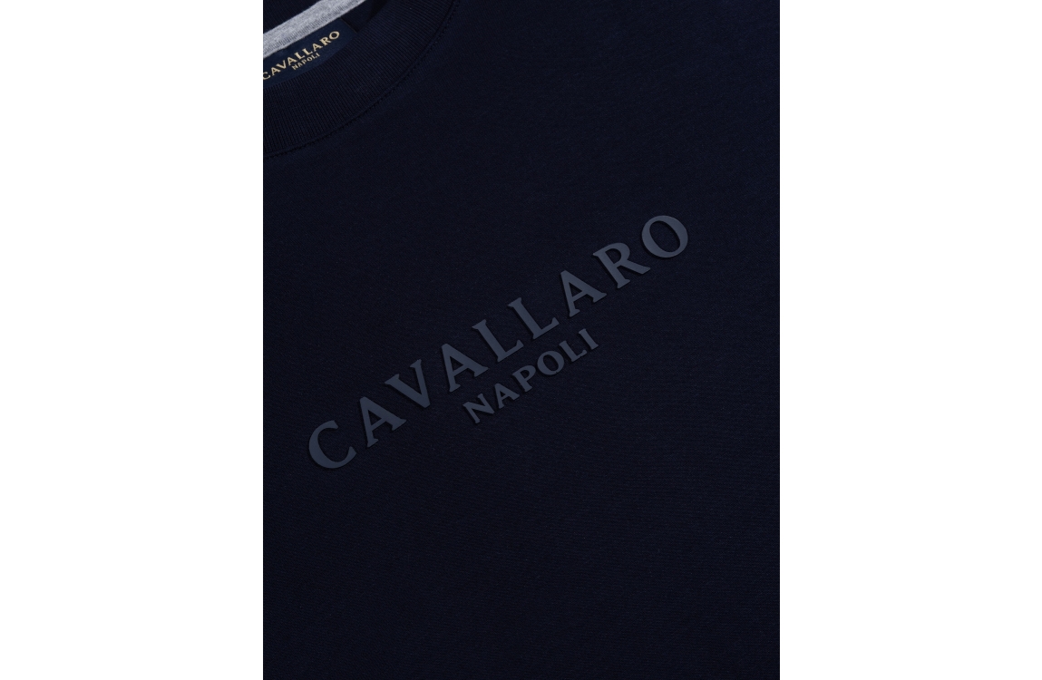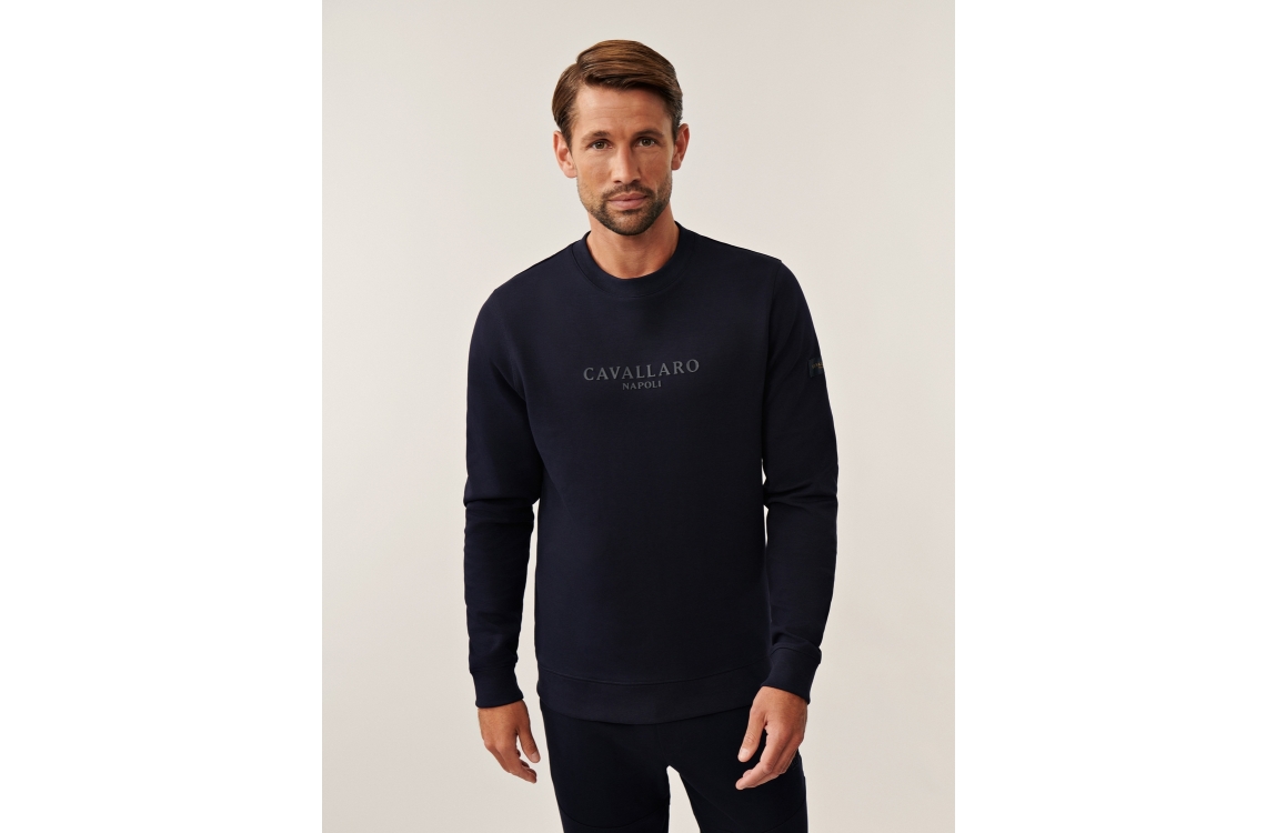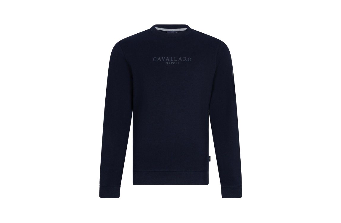 Cavallaro Sanago R Neck Sweat 699000 Dark blue. Dit regular fit model heeft een ronde kraag en lange mouwen. Deze donker blauwe sweater van Cavallaro heeft het logo midden op de borst en heeft afgewerkte boorden. Het model is 187 cm en draagt maat M.