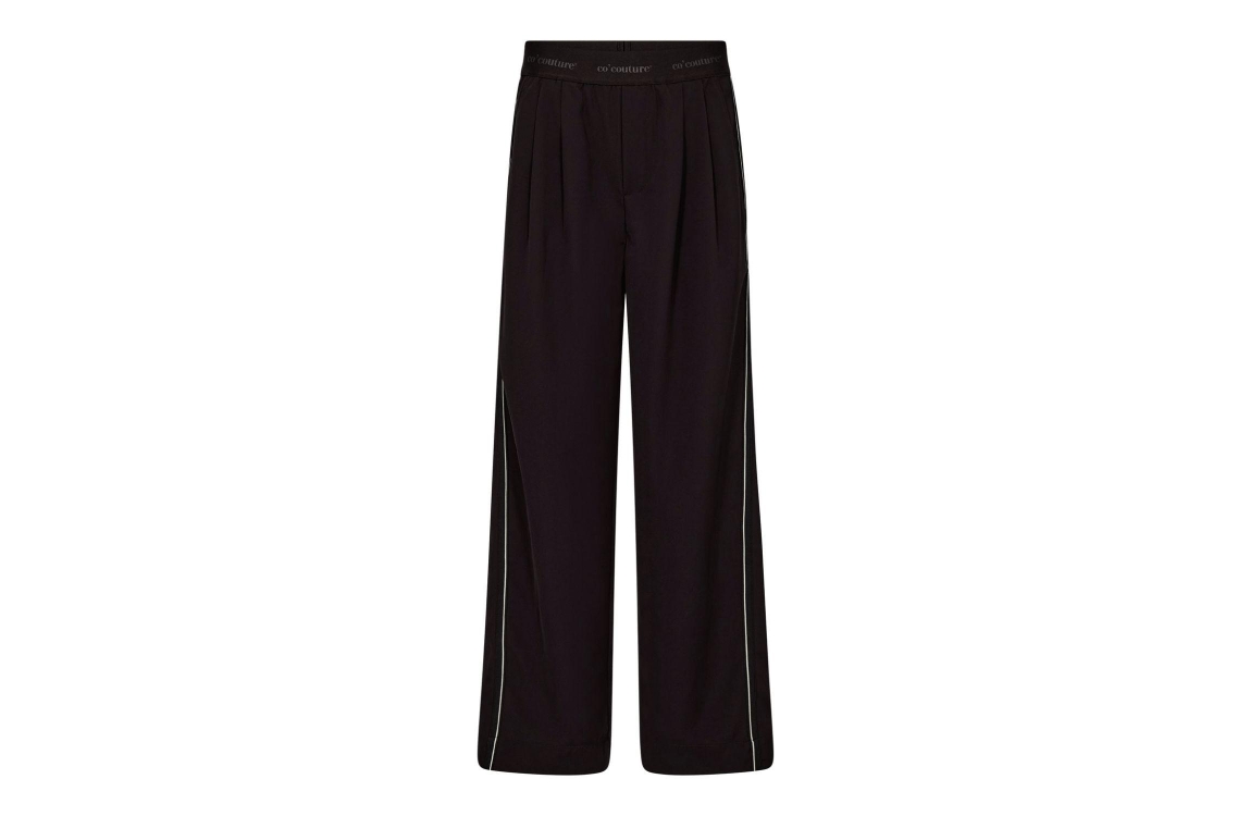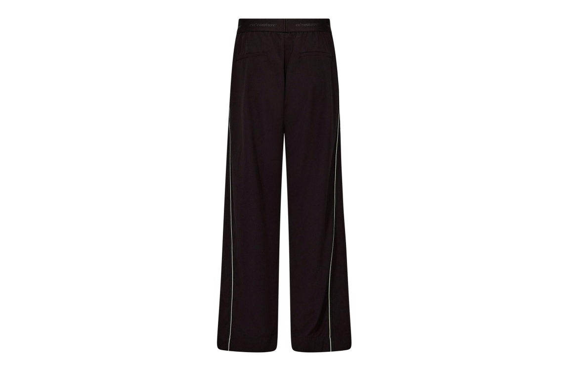 Co Couture AminaCC Split Panel LL Pant Black. Dit wide fit model sluit door middel van een elastische boord, gedetailleerd met het merklogo. Deze zwarte broek van Co Couture is voorzien van twee steekzakken aan de voorzijde en twee paspelzakken aan de achterzijde. Het model is afgewerkt met een biesdetail langs de zijkanten.