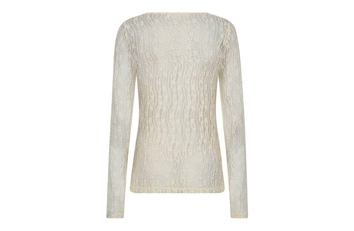 Co Couture BarbCC O-Neck Blouse Off white. Dit aangesloten model heeft een ronde hals en lange mouwen. Deze off-white top van Co Couture is uitgevoerd in een doorschijnend materiaal en bewerkt met een grafische print.