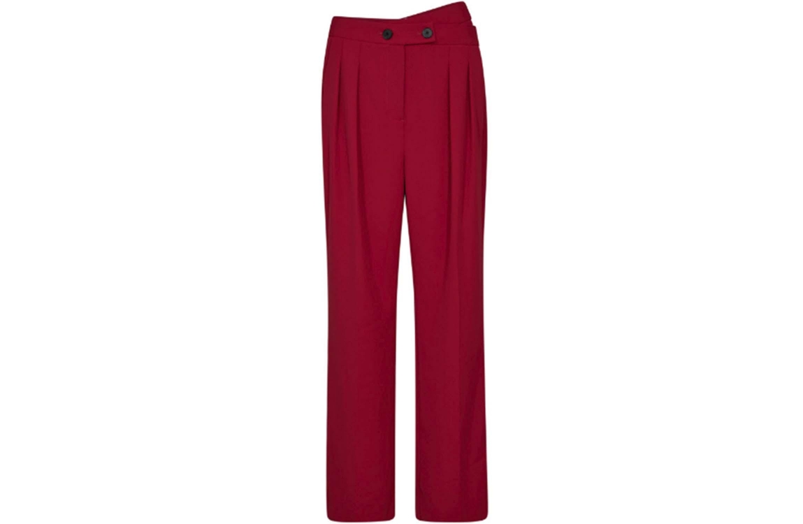 Co Couture pantalon 31104. Dit wide leg model sluit door middel van een rits en een knoopsluiting. Deze rode pantalon van Co Couture beschikt over twee steekzakken aan de voorzijde, twee paspelzakken aan de achterzijde en is afgewerkt met plooidetails aan de bovenzijde. Dit model is aan de ene kant hoger uitgevoerd bij de taille.