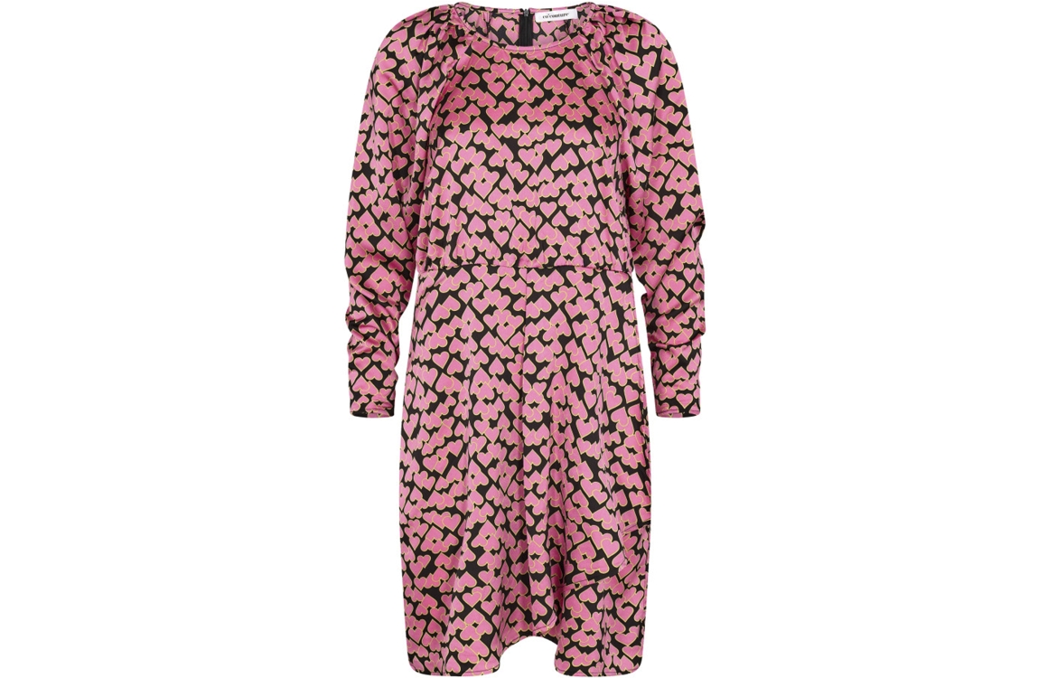 Co Couture jurk Flashy 36186. Dit rechtvallend model is voorzien van een ronde hals, een overslag aan de onderzijde en heeft driekwart pofmouwen. Deze roze jurk van Co Couture is all-over bewerkt met een harten dessin en is afgewerkt met plooidetails aan de onder- voorzijde. Dit model sluit aan de achterzijde van een rits en een elastische band in de taille.