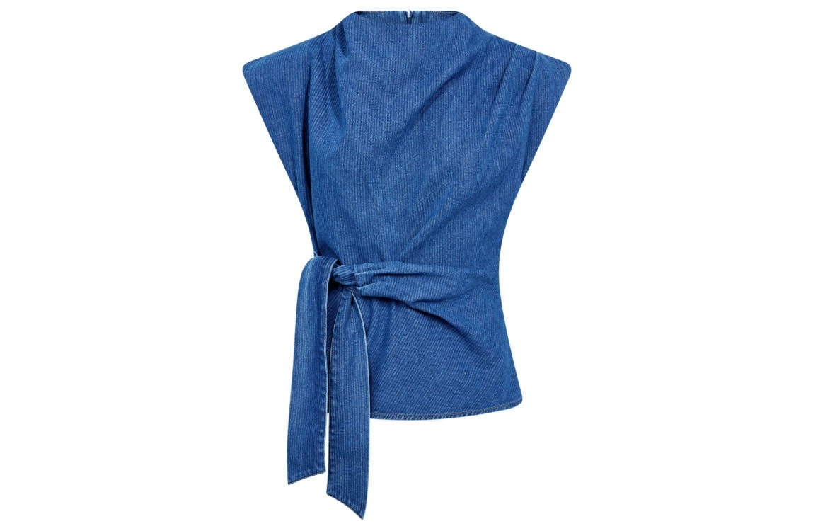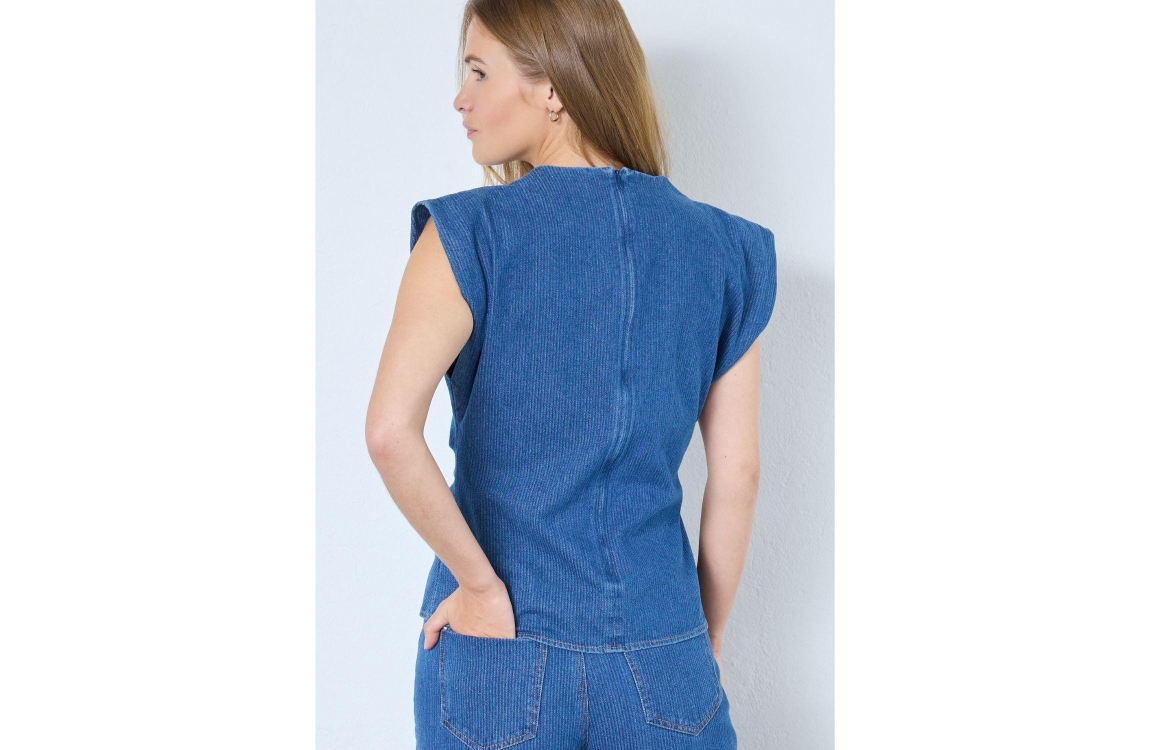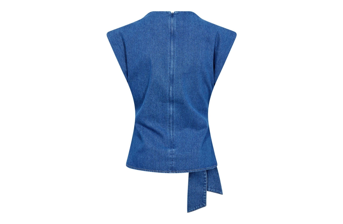 Co Couture KimmyCC Pleat Top Dark Denim. Dit aangesloten model heeft een ronde hals en is mouwloos. Deze denim top van Co Couture sluit aan de achterzijde door middel van een rits en heeft aan de voorzijde een strikdetail. Dit model heeft een bijpassende broek.