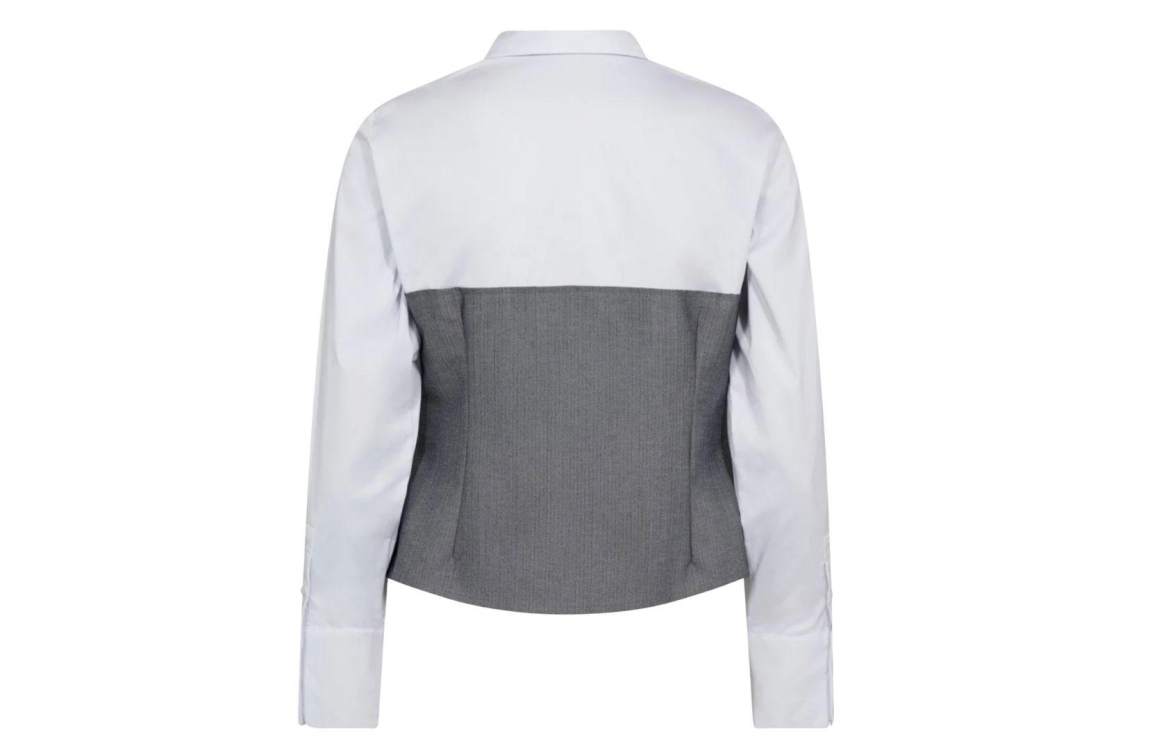 Co Couture blouse PollyCC 45028. Dit rechtvallend korte model is voorzien van een kraag en heeft lange mouwen. Deze witte blouse van Co Couture sluit door middel van knopen en is bewerkt met een grijze corsage-look.