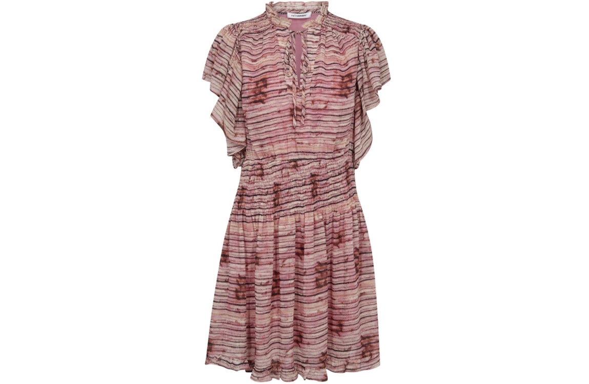 Co Couture jurk tie line 36347. Dit korte model is voorzien van een ronde hals met v-inkeping en heeft korte sierlijke mouwen. Deze roze jurk van Co Couture is bewerkt met strepen en beschikt over een onderjurk. Dit model is voorzien van ruches en een strikkoord bij de hals en is bij de taille en schouders afgewerkt met smock.