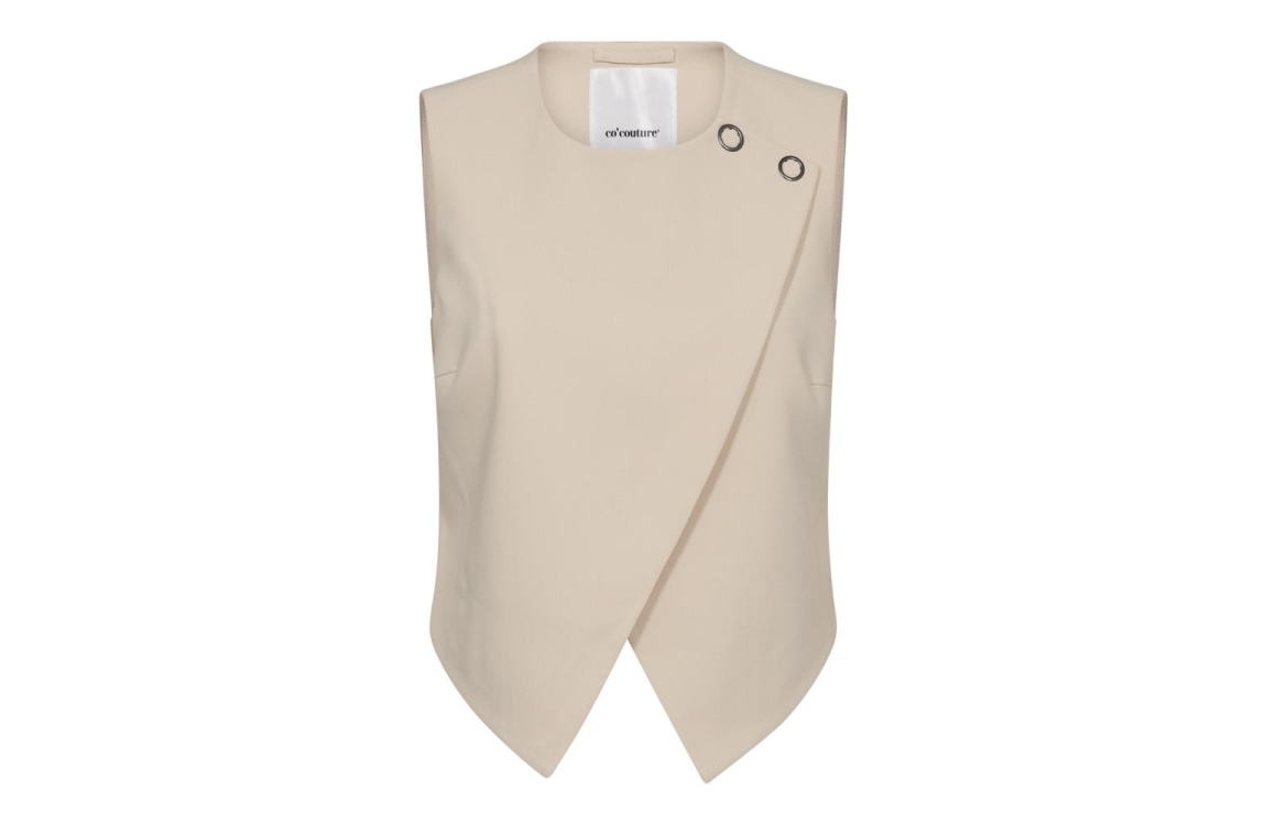 Co Couture volacc wrap 30289 gilet. Dit rechtvallende model heeft een ronde hals en is mouwloos. Dit beige gilet van Co Couture sluit door middel van knopen aan de zijkant en is uitgevoerd in een schuin/punt voorzijde.