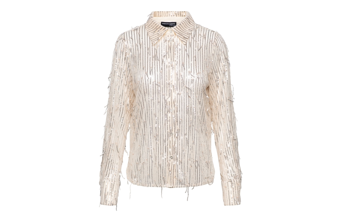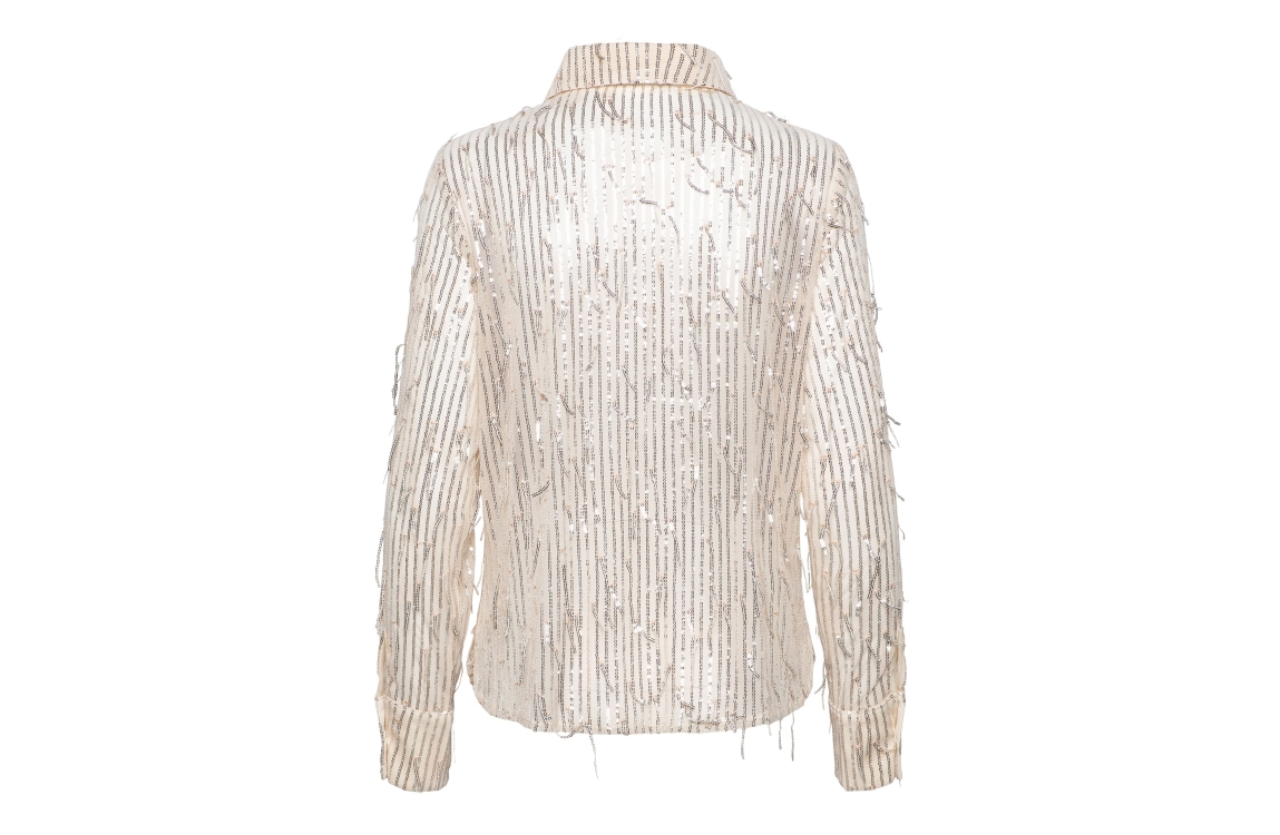 &Co Woman blouse BL381. Dit rechtvallende model heeft een kraag en lange mouwen. Deze creamkleurige blouse van &Co Woman sluit aan de voorzijde door middel van knopen en is semi-transparant uitgevoerd. Het model is all-over bewerkt met glitterdraden en pailletten.