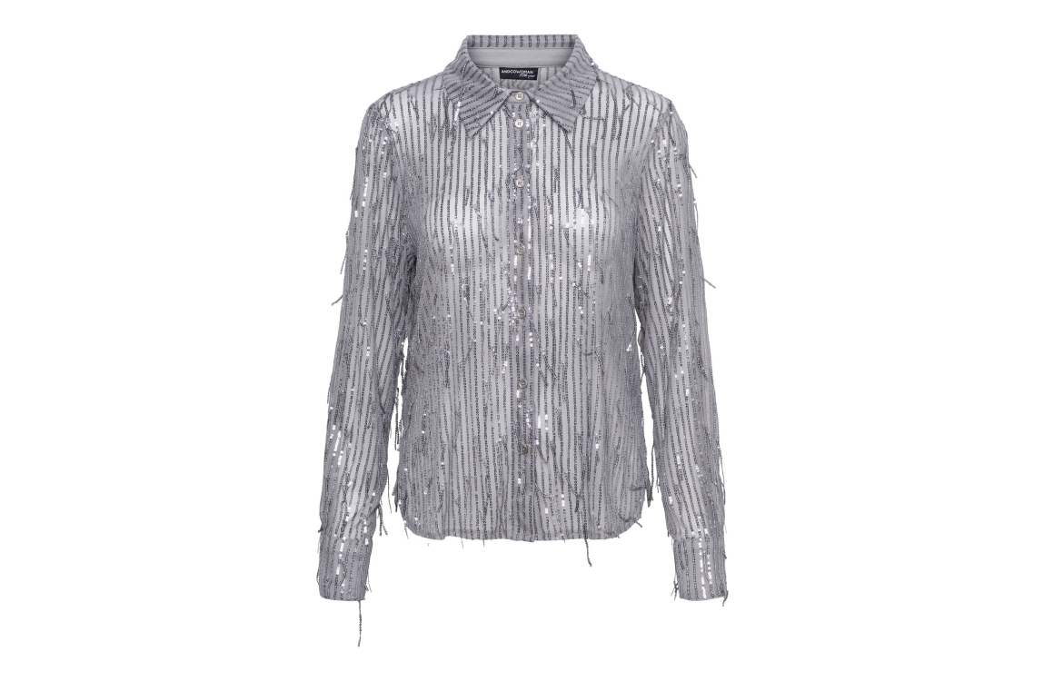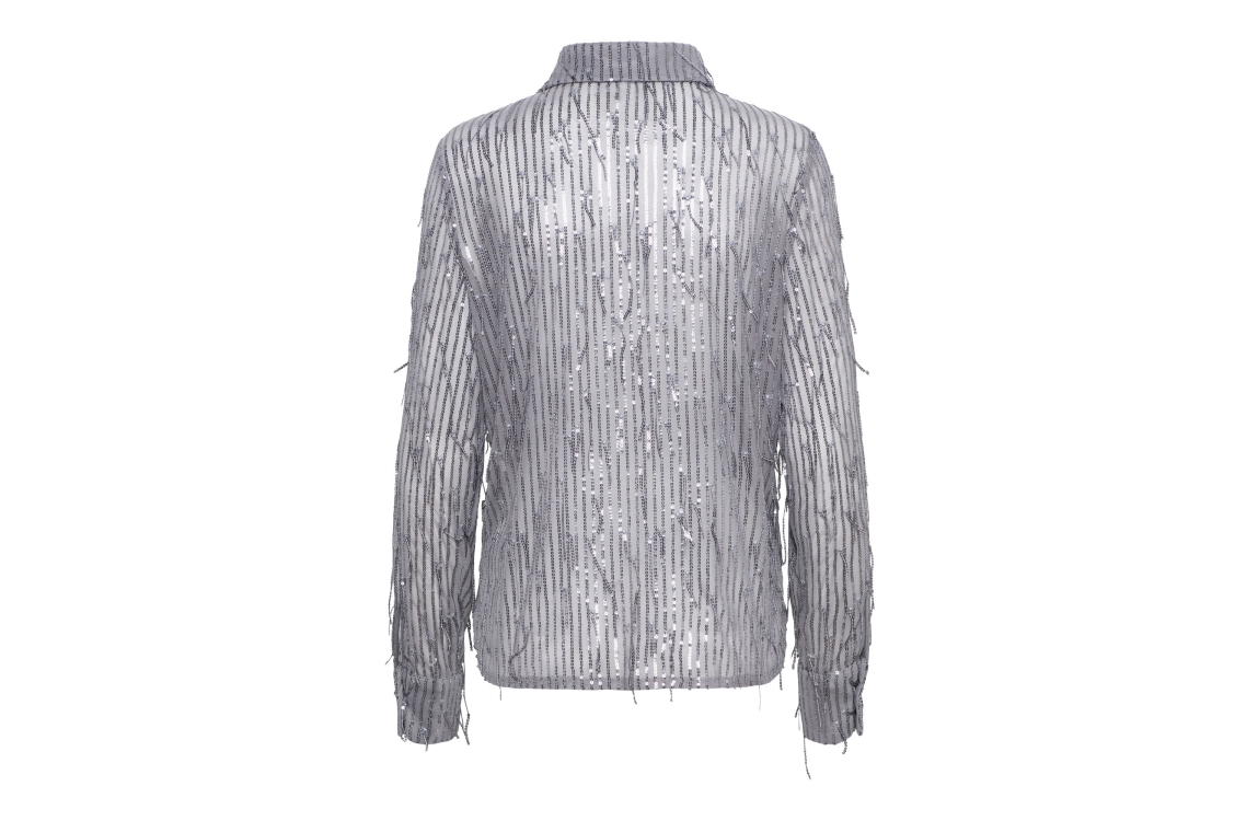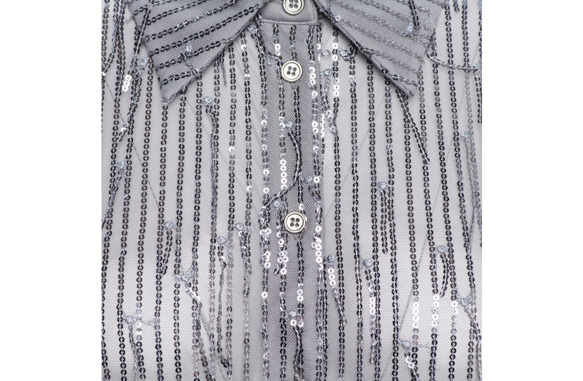 &Co Woman blouse BL381. Dit rechtvallende model heeft een kraag en lange mouwen. Deze zilverkleurige blouse van &Co Woman sluit aan de voorzijde door middel van knopen en is semi-transparant uitgevoerd. Het model is all-over bewerkt met glitterdraden en pailletten.