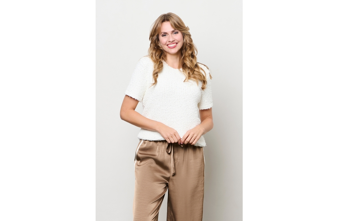 &Co Woman pullover Bianca PU144. Dit rechtvallend model is voorzien van een ronde hals met en heeft korte mouwen. Deze witte pullover van &Co Woman is bewerkt met decoratieve knopen op de schouder en is all-over gestructeerd uitgevoerd in een bouclé kwaliteit.