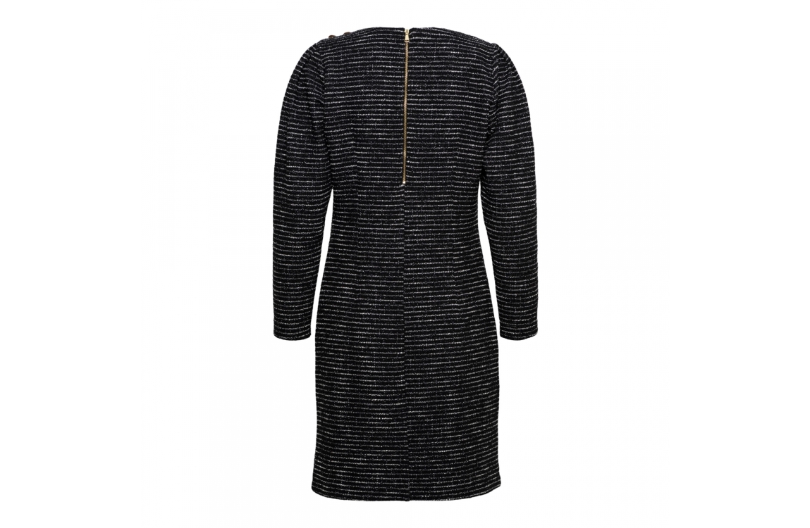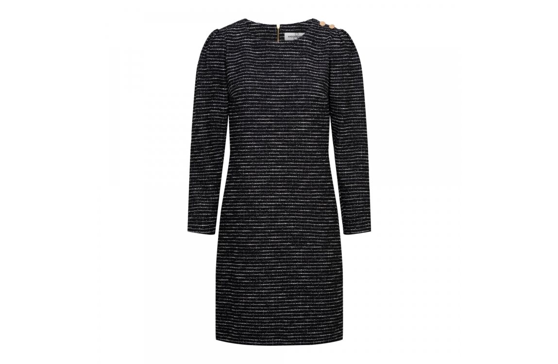 &Co Woman jurk Casey DR239. Dit regular fit model heeft lange mouwen en een ronde hals. Deze zwarte jurk van &Co Woman sluit aan de achterzijde door middel van een rits en is gedetailleerd met gouden knopen op de schouder.