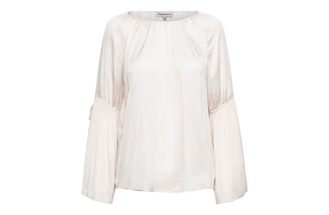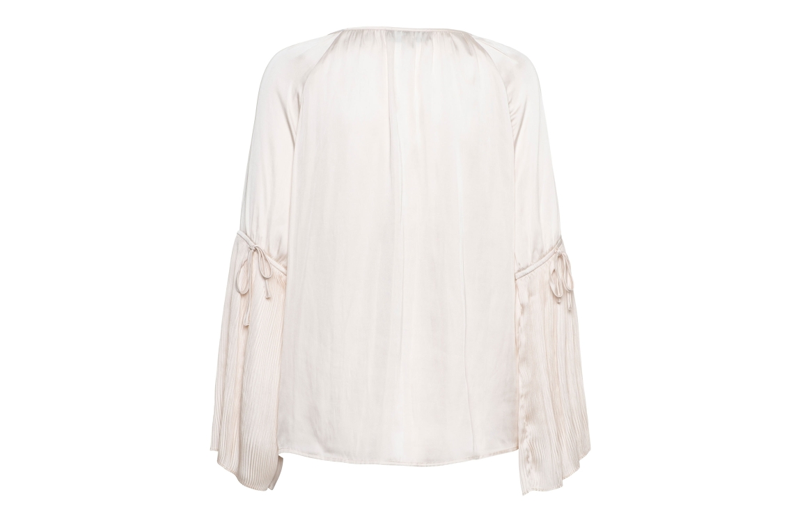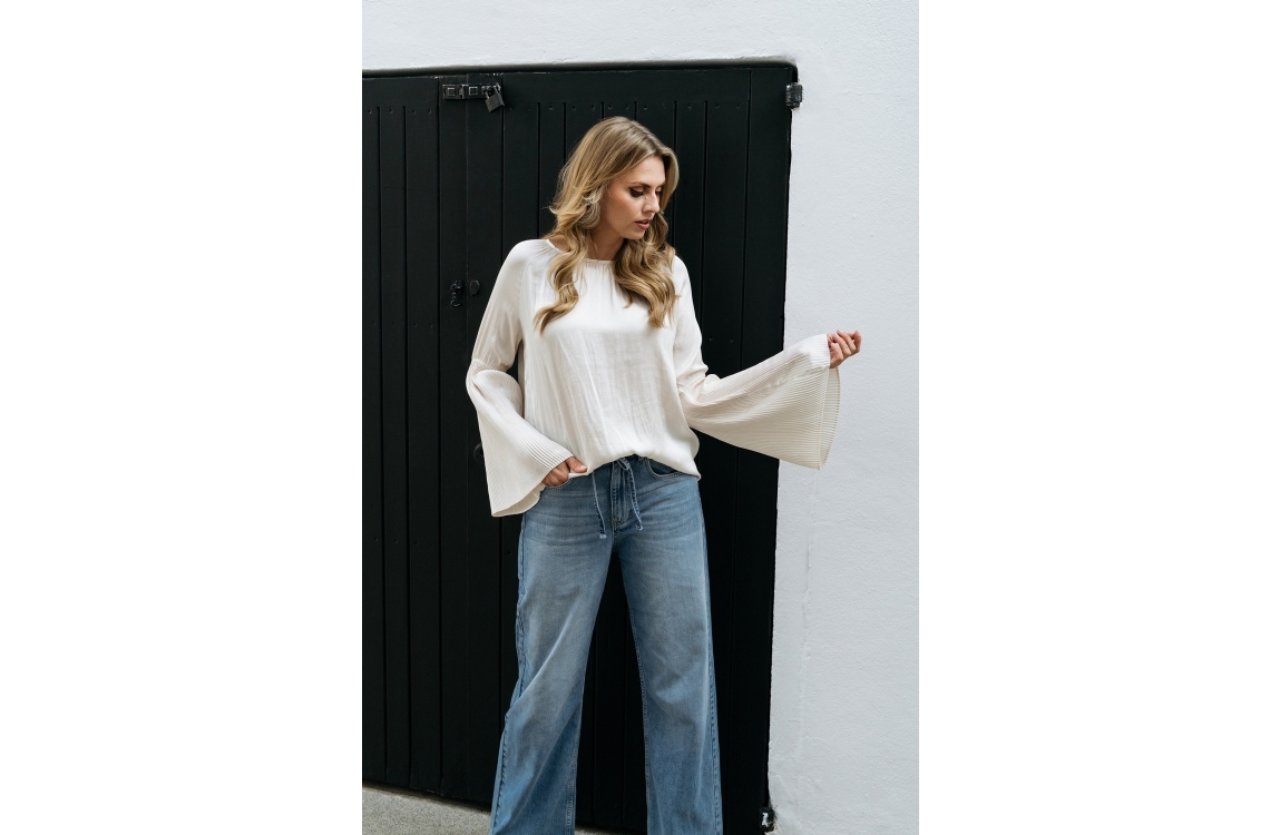 Co Woman CORALIE 55021 m-beige. Dit soepelvallende model is voorzien van een ronde hals en lange mouwen. Deze beige top van &Co Woman heeft uitlopende mouwen met een strikdetail bij de elleboog.