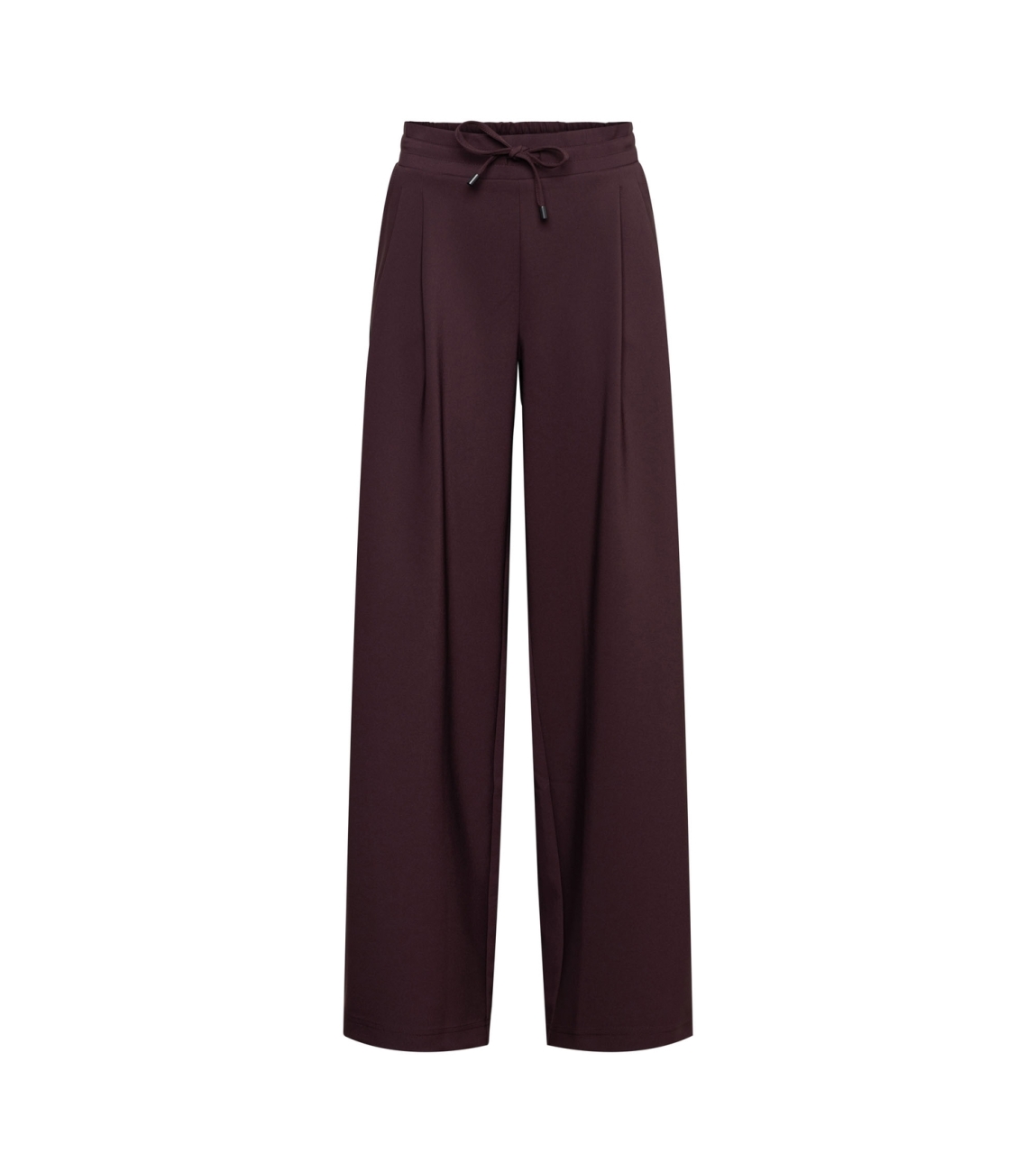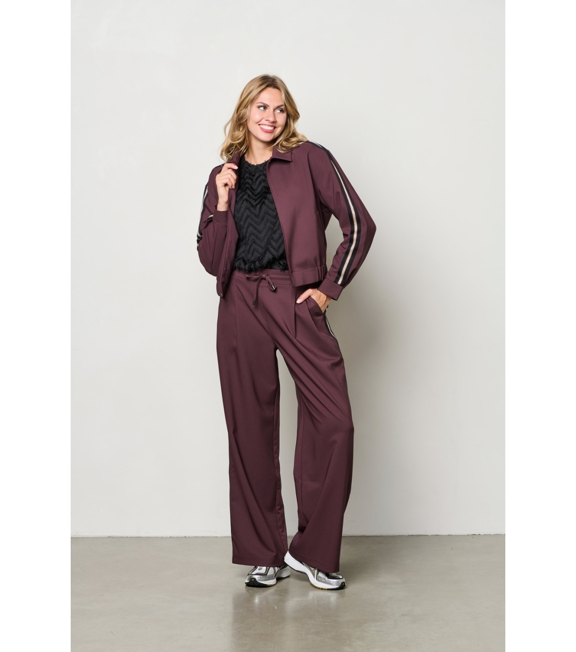 Co Woman FIENE 56081 la-aubergine. Dit rechtvallende model sluit door middel van een elastische boord en een afneembaar strikkoord. Deze bordeaux rode broek van &Co Woman beschikt over twee steekzakken aan de voorzijde en twee paspelzakken aan de achterzijde. Dit model is aan de zijkant bewerkt met een tape in de kleuren zwart en goud.