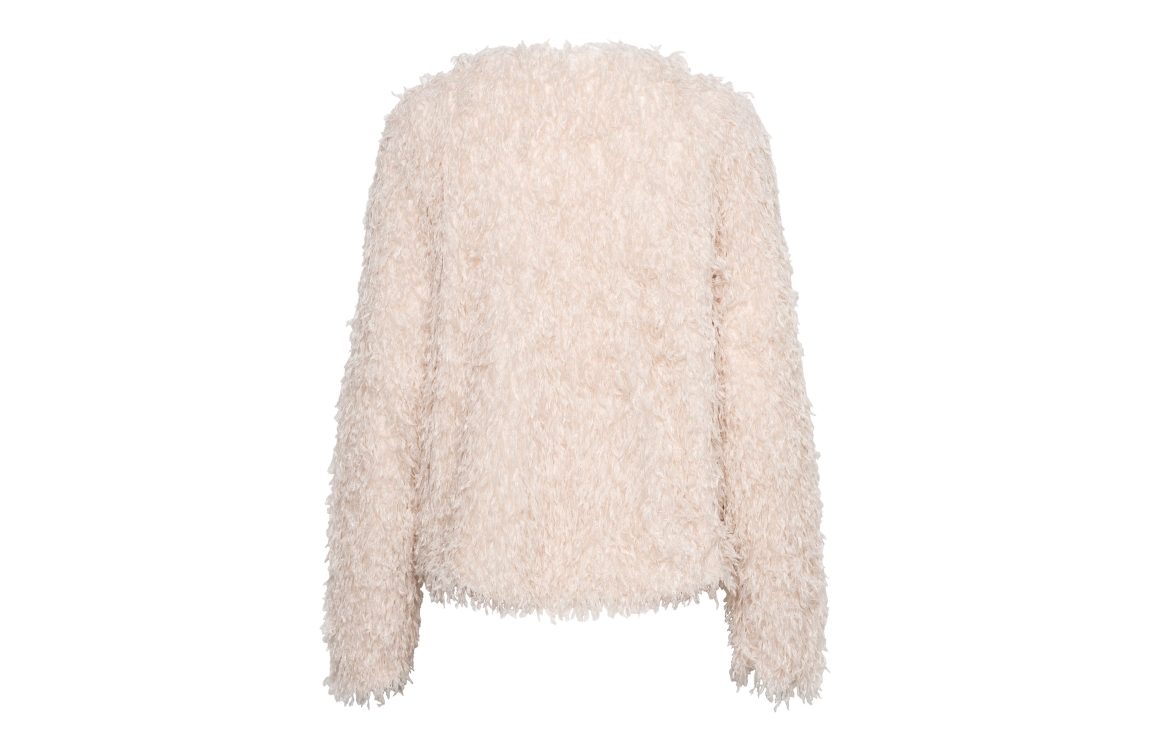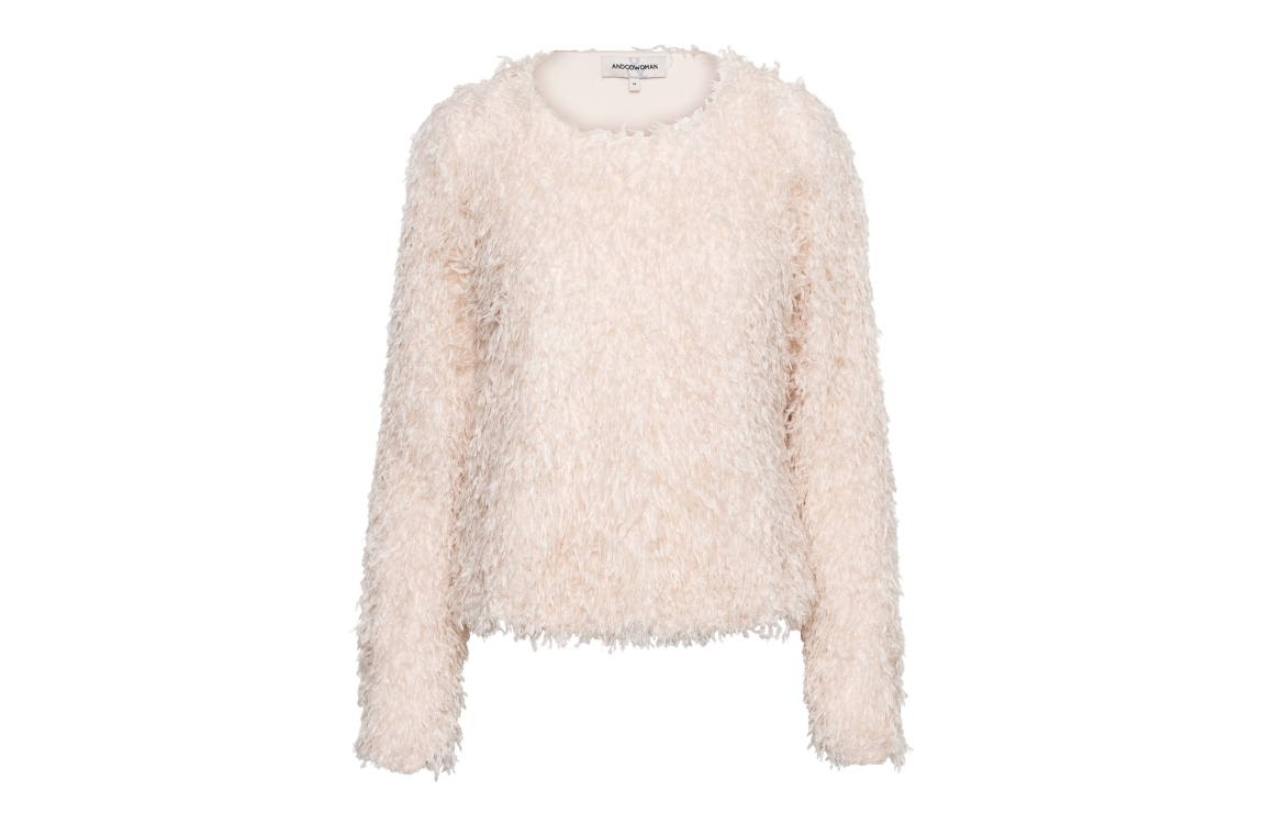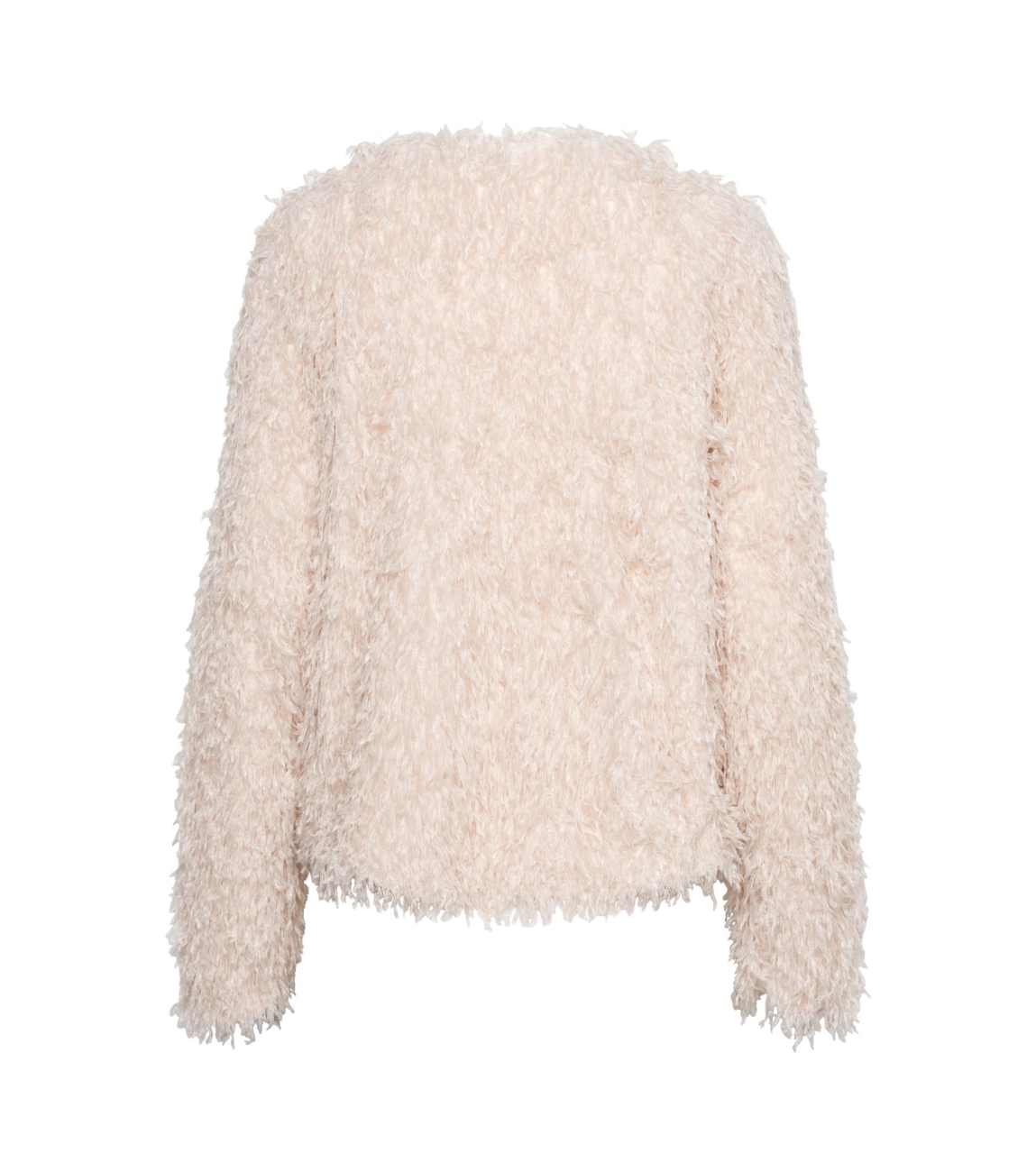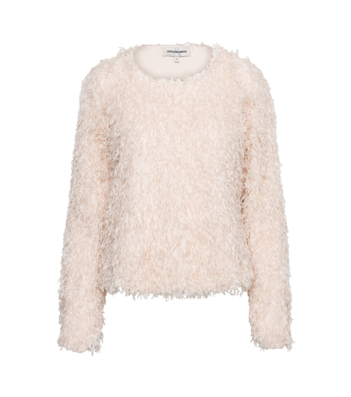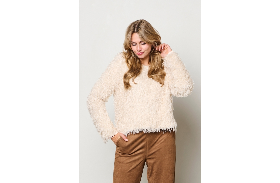 Co Woman HEATHER 56020 m-beige. Dit rechtvallende model is voorzien van een ronde hals en heeft lange mouwen. Deze beige top van &Co Woman is bewerkt met harige franjes all-over.