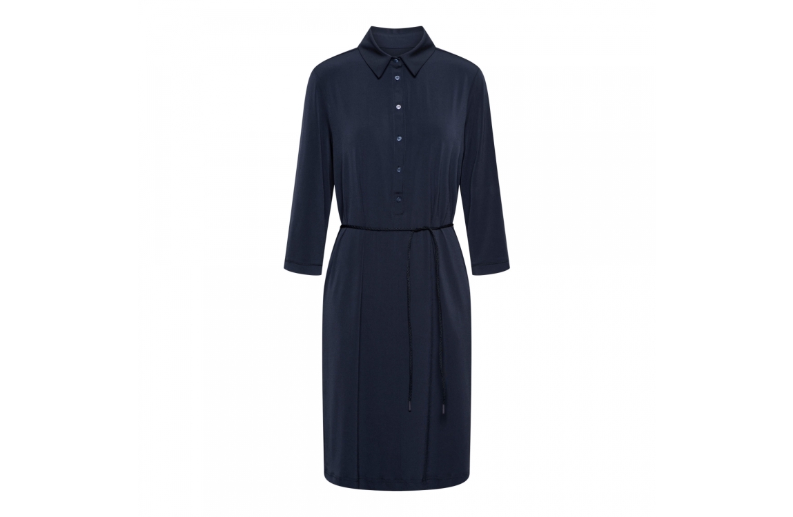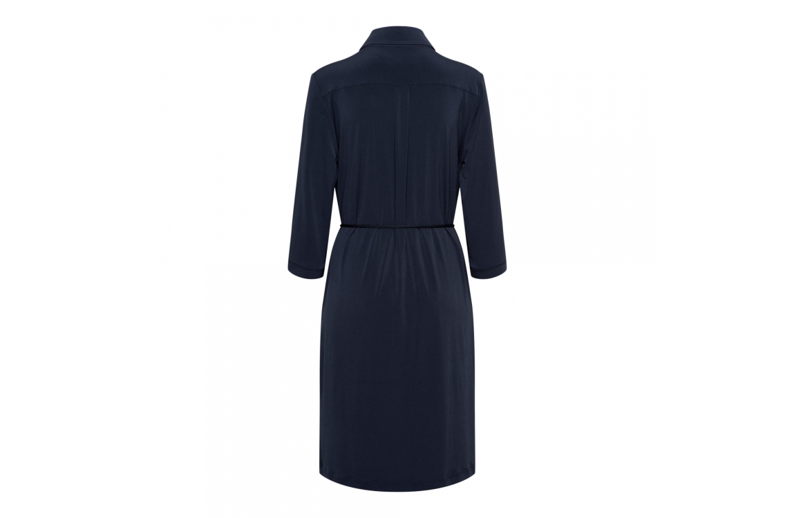 &Co Woman jurk Lola DR256. Dit rechtvallend model is voorzien van een kraag en heeft driekwart mouwen. Deze donkerblauwe traveljurk van &Co Woman sluit door middel van knopen en een afneembare strikkoord.
