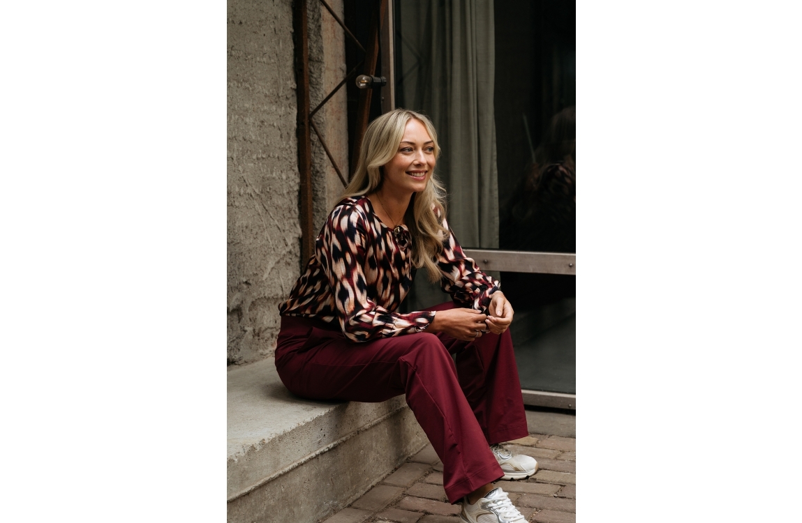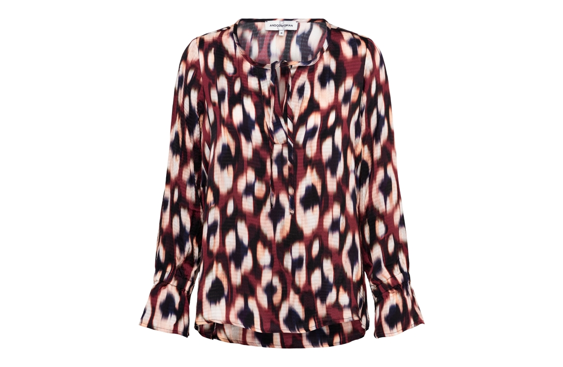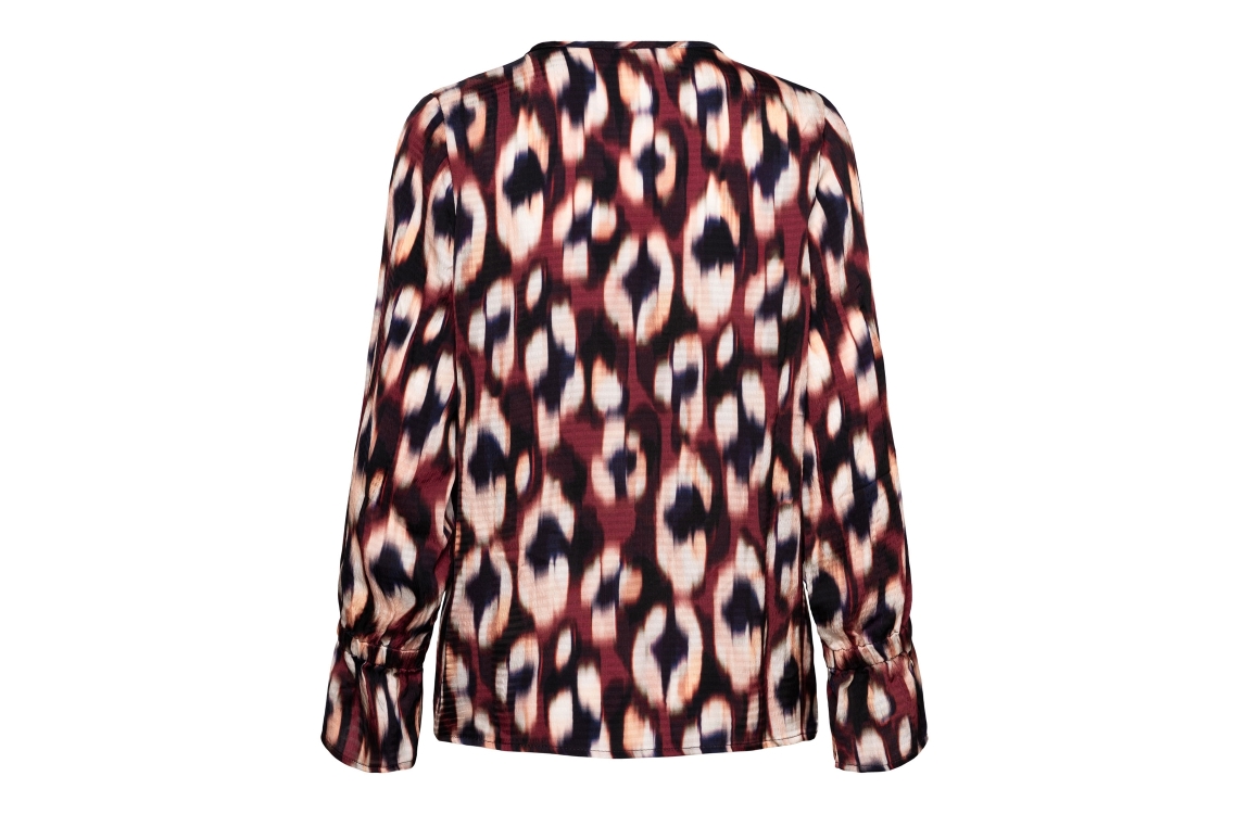 &Co Woman blouse Melina Faded BL396. Dit rechtvallend model is voorzien van een ronde hals met v-inkeping dat sluit door middel van een strik en heeft lange mouwen met ruches aan de uiteinden. Deze rode blouse van &Co Woman is all-over bewerkt met een print in verschillende kleuren.