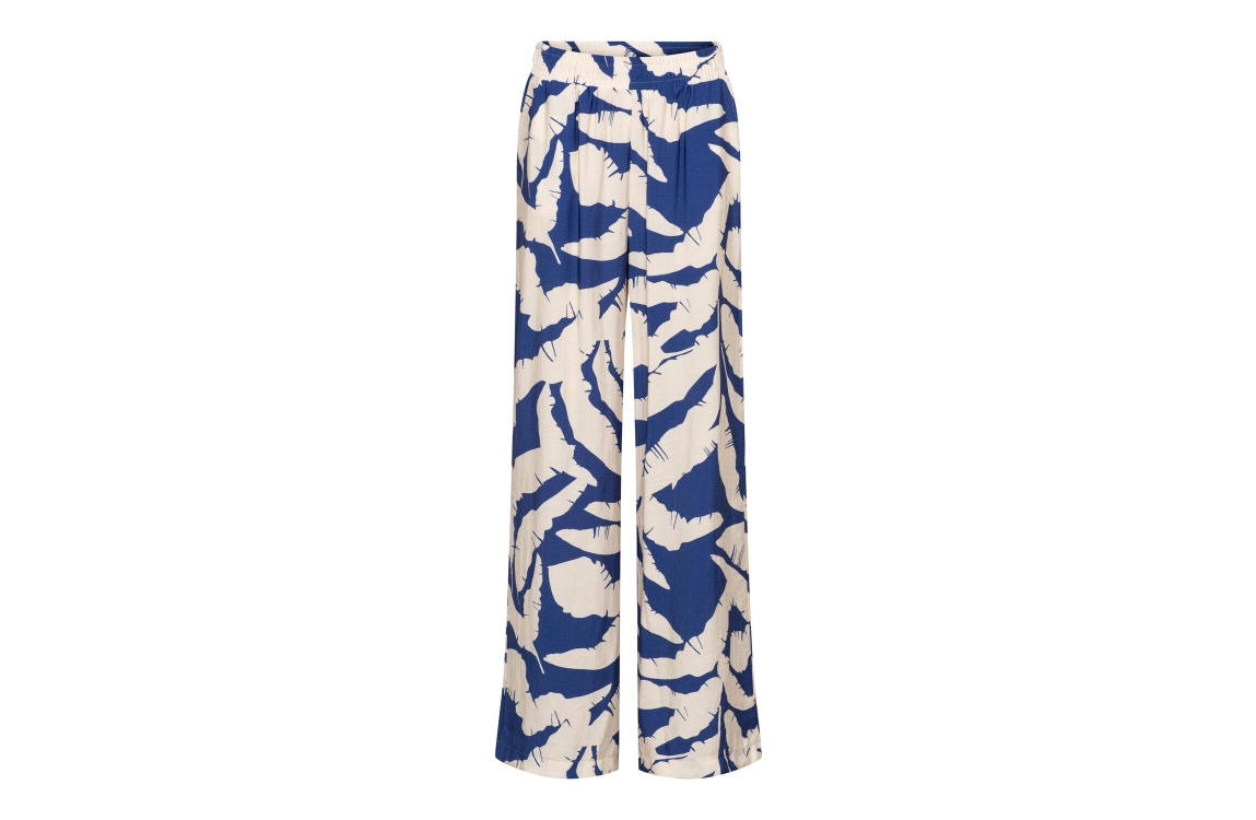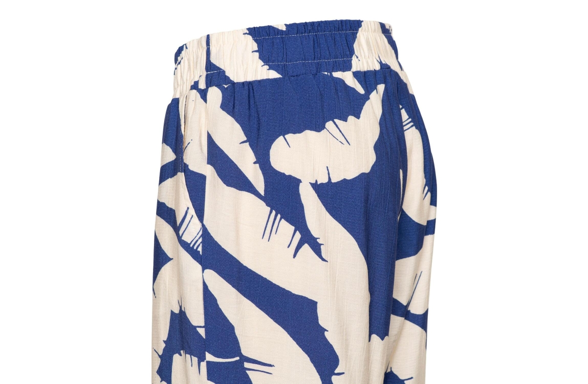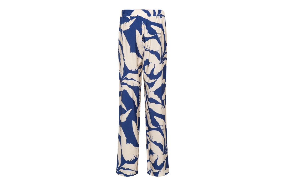 &Co Woman Nadine broek PA376. Dit straight fit model sluit door middel van een elastische boord en beschikt over twee steekzakken aan de voorzijde. Deze beige/blauwe broek van &Co Woman is bewerkt met een print.