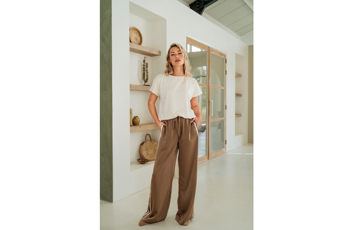 &Co Woman broek Neomi PA407. Dit wide leg model sluit door middel van een elastische boord met trekkoorden. Deze bruine satijnen look broek van &Co Woman beschikt over steekzakken aan de voor- en achterzijde. Dit model is bewerkt met witte strepen aan de zijkanten.
