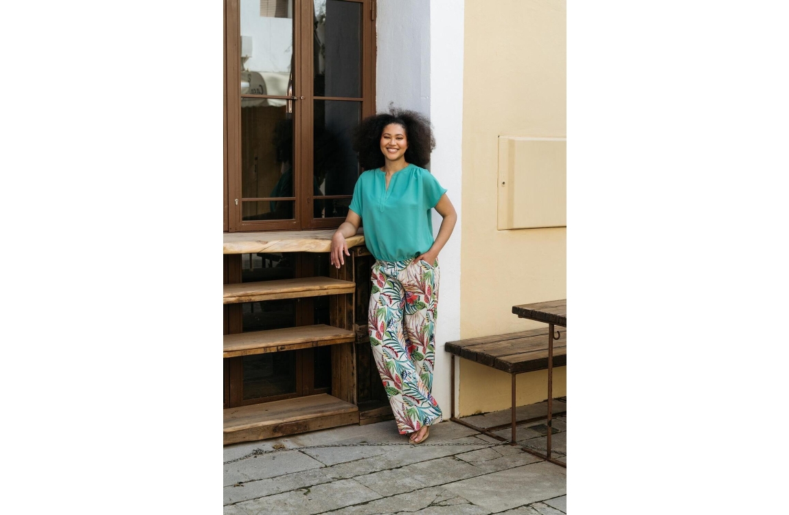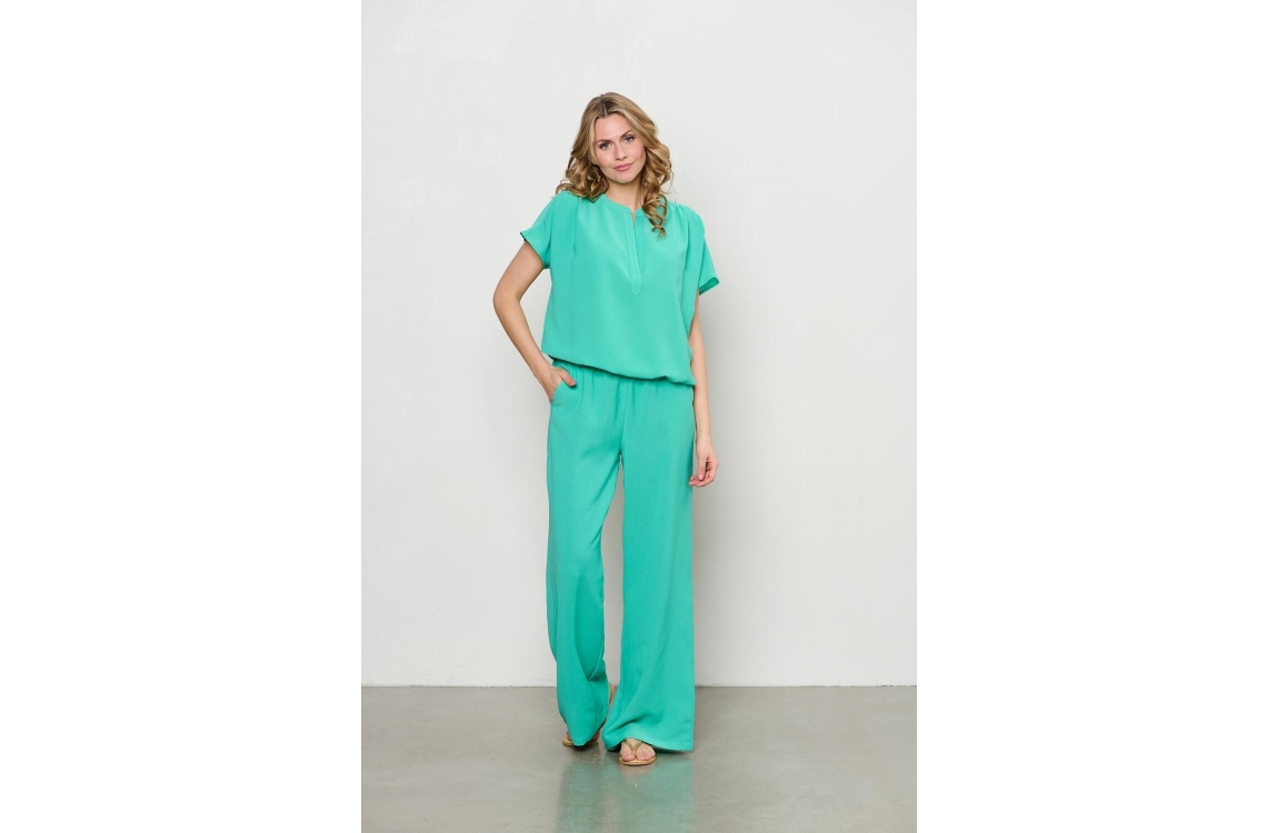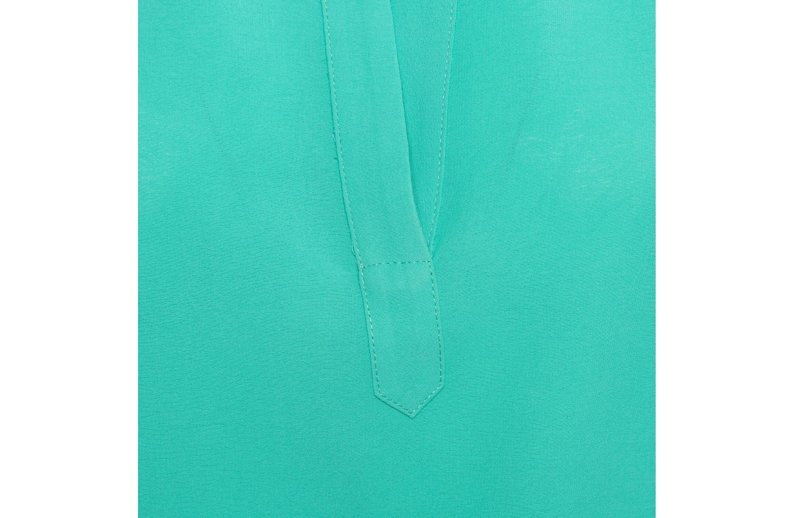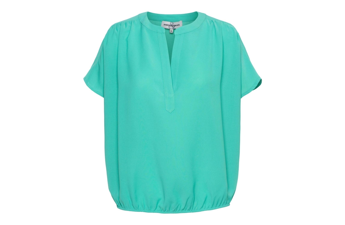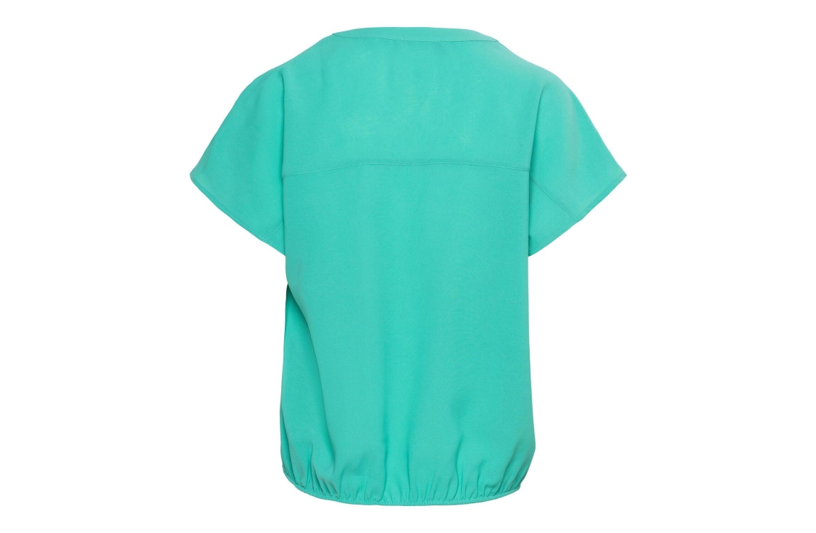 &Co Woman top BL371. Dit rechtvallend model heeft een ronde hals met V-inkeping en korte mouwen. Deze aqua-groene top van &Co Woman is op de schoudernaden bewerkt met plooidetails en beschikt over een elastische onderboord.