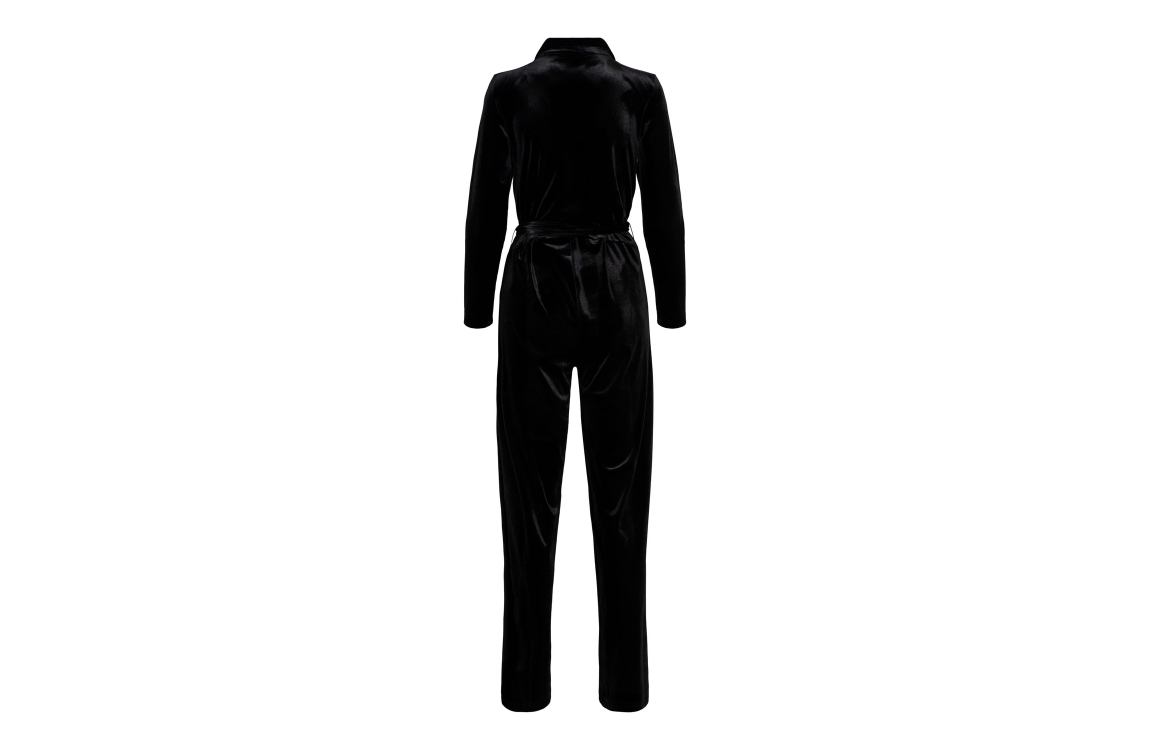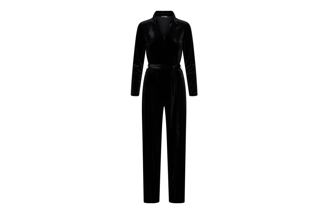 Co Woman jumpsuit Oslo JU112. Dit regular fit model heeft een V-hals met reverskraag en lange mouwen. Deze zwarte jumpsuit van &Co Woman is uitgevoerd in velour-kwaliteit en is bewerkt met een strikceintuur in de taille.