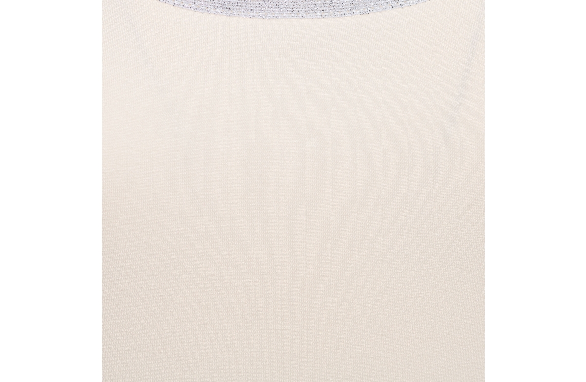 &Co Woman top Selly SG112. Dit aangesloten beige model is voorzien van een ronde hals en heeft spaghettibandjes beide bewerkt met een zilverkleurige glitter.